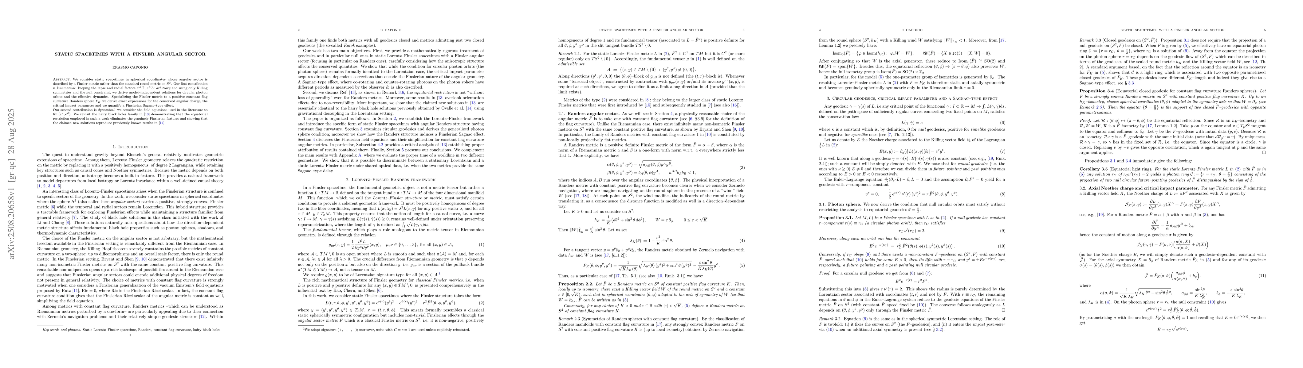 We consider static spacetimes in spherical coordinates whose angular sector is described by a Finsler metric rather than the standard round metric on $S^2$. Our first contribution is kinematical: keeping the lapse and radial factors $e^{\nu(r)}$, $e^{\vartheta(r)}$ arbitrary and using only Killing symmetries and the null constraint, we derive model--independent relations for circular photon orbits and the effective dynamics. Specializing the Finsler metric to a positive constant flag curvature Randers sphere we derive exact expressions for the conserved angular charge and the critical impact parameter, and we quantify a Finslerian Sagnac--type effect. Our second contribution is dynamical: we consider the field equations used in the literature to fix $(e^{\nu},e^{\vartheta})$. We revisit the hairy black hole family in a recent paper by Nekouee et al. demonstrating that the equatorial restriction employed in such a work eliminates the genuinely Finslerian features and showing that the claimed new solutions reproduce previously known results obtained by Ovalle et al.