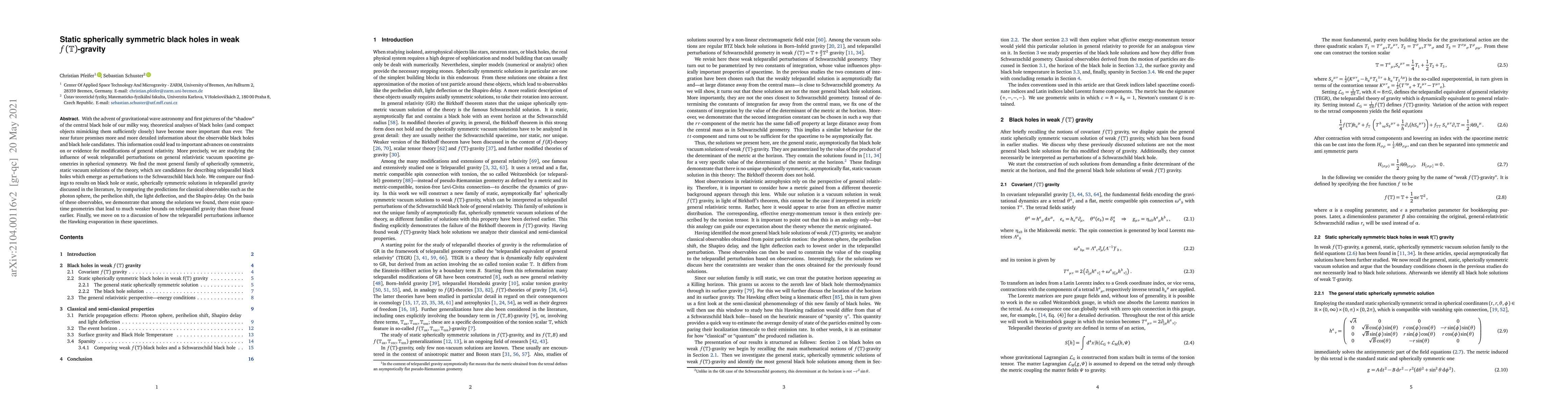 With the advent of gravitational wave astronomy and first pictures of the "shadow" of the central black hole of our milky way, theoretical analyses of black holes (and compact objects mimicking them sufficiently closely) have become more important than ever. The near future promises more and more detailed information about the observable black holes and black hole candidates. This information could lead to important advances on constraints on or evidence for modifications of general relativity. More precisely, we are studying the influence of weak teleparallel perturbations on general relativistic vacuum spacetime geometries in spherical symmetry. We find the most general family of spherically symmetric, static vacuum solutions of the theory, which are candidates for describing teleparallel black holes which emerge as perturbations to the Schwarzschild black hole. We compare our findings to results on black hole or static, spherically symmetric solutions in teleparallel gravity discussed in the literature, by comparing the predictions for classical observables such as the photon sphere, the perihelion shift, the light deflection, and the Shapiro delay. On the basis of these observables, we demonstrate that among the solutions we found, there exist spacetime geometries that lead to much weaker bounds on teleparallel gravity than those found earlier. Finally, we move on to a discussion of how the teleparallel perturbations influence the Hawking evaporation in these spacetimes.