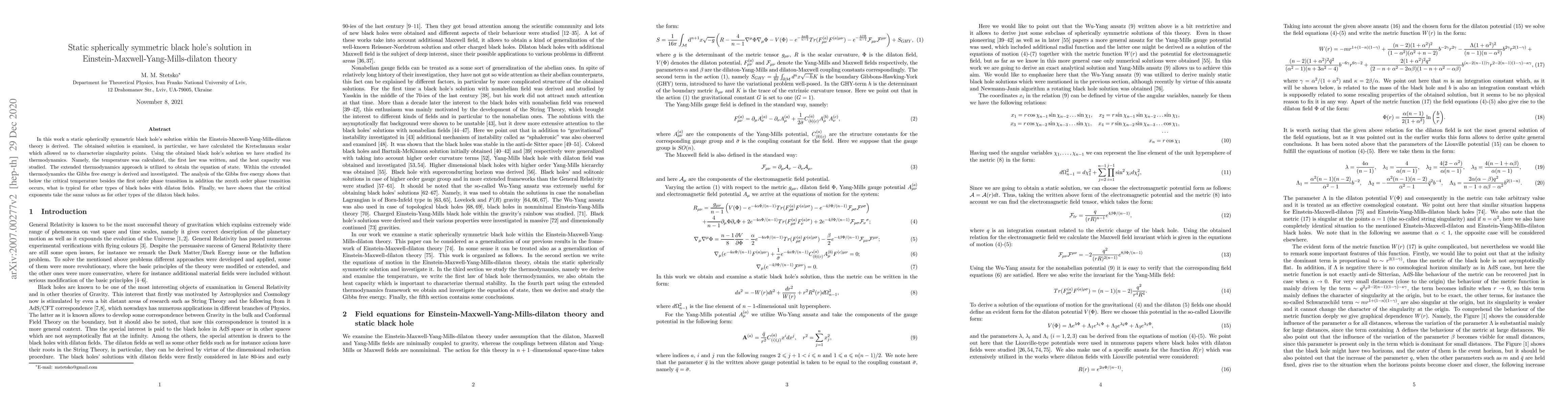 In this work a static spherically symmetric black hole's solution within the Einstein-Maxwell-Yang-Mills-dilaton theory is derived. The obtained solution is examined, in particular, we have calculated the Kretschmann scalar which allowed us to characterize singularity points. Using the obtained black hole's solution we have studied its thermodynamics. Namely, the temperature was calculated, the first law was written, and the heat capacity was studied. The extended thermodynamics approach is utilized to obtain the equation of state. Within the extended thermodynamics the Gibbs free energy is derived and investigated. The analysis of the Gibbs free energy shows that below the critical temperature besides the first order phase transition in addition the zeroth order phase transition occurs, what is typical for other types of black holes with dilaton fields. Finally, we have shown that the critical exponents take the same values as for other types of the dilaton black holes.