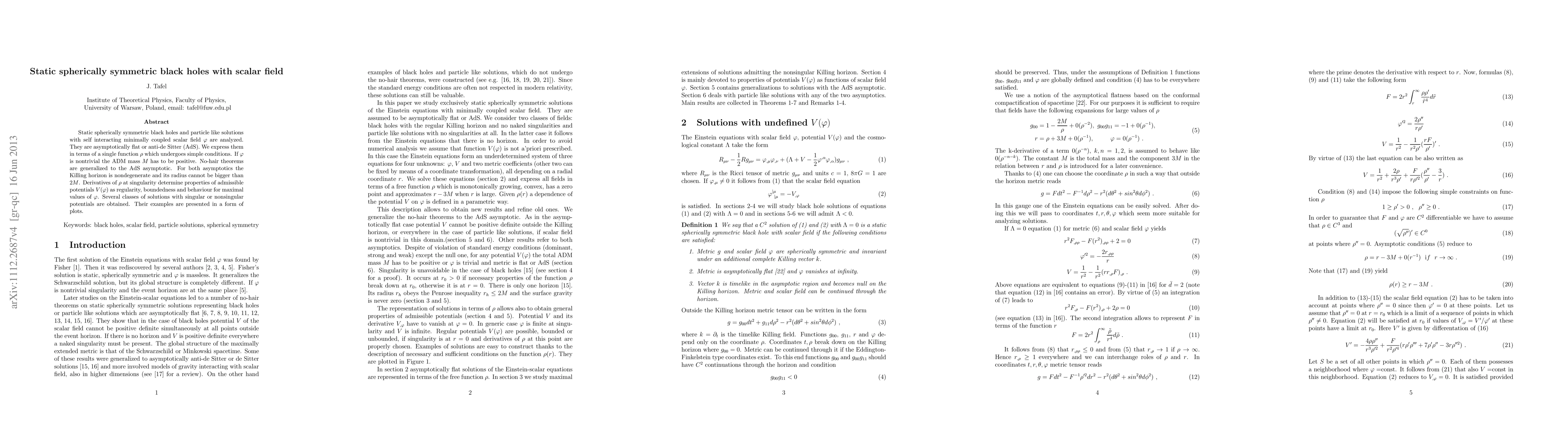 Static spherically symmetric black holes and particle like solutions with self interacting minimally coupled scalar field {\phi} are analyzed. They are asymptotically flat or anti-de Sitter (AdS). We express them in terms of a single function {\rho} which undergoes simple conditions. If {\phi} is nontrivial the ADM mass M has to be positive. No-hair theorems are generalized to the AdS asymptotic. For both asymptotics the Killing horizon is nondegenerate and its radius cannot be bigger than 2M. Derivatives of {\rho} at singularity determine properties of admissible potentials V({\phi}) as regularity, boundedness and behaviour for maximal values of {\phi}. Several classes of solutions with singular or nonsingular potentials are obtained. Their examples are presented in a form of plots.