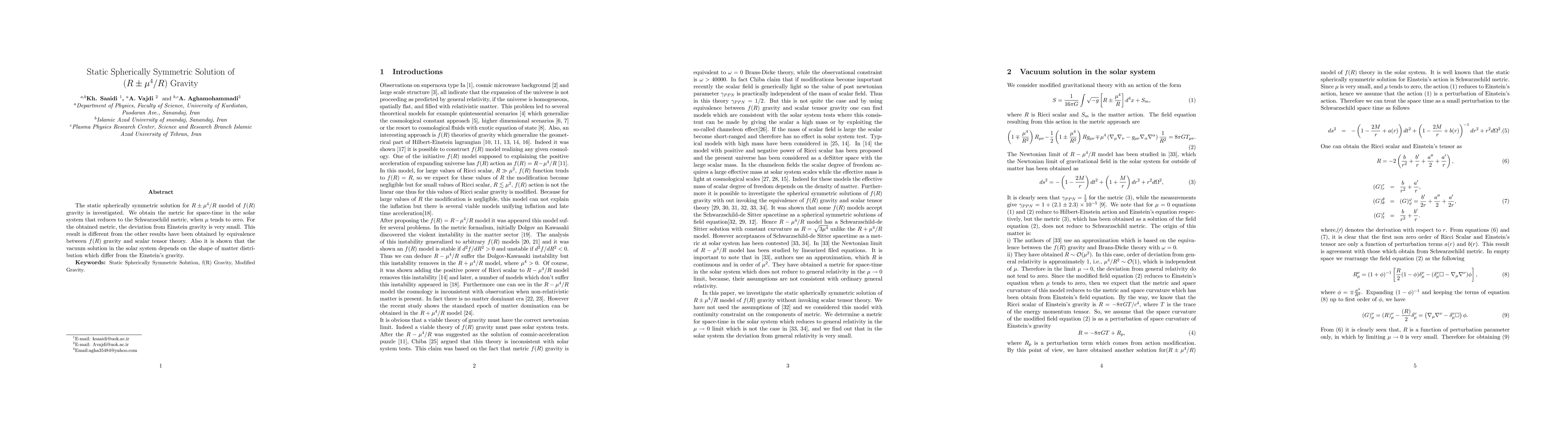 This paper investigates the static spherically symmetric solution for (R ± μ^4/R) f(R) gravity, deriving a metric that approximates the Schwarzschild metric when μ approaches zero. The study reveals small deviations from Einstein's gravity and shows that the vacuum solution depends on matter distribution, differing from Einstein's predictions.