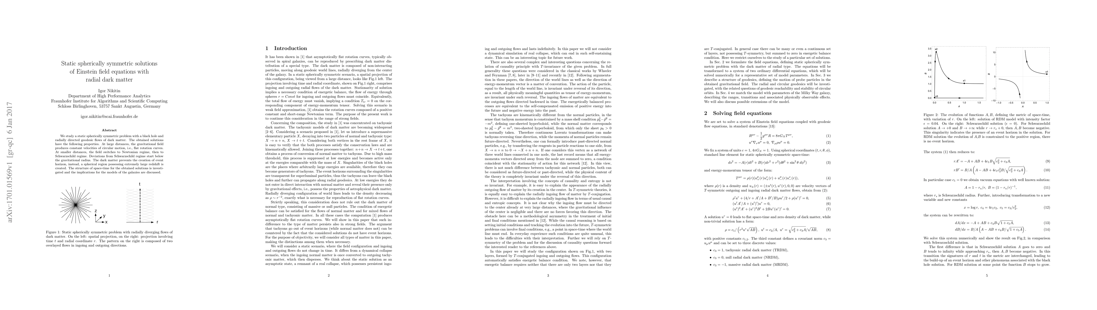 Researchers find static spherically symmetric solutions to Einstein field equations with radial dark matter, creating a region with flat rotation curves at large distances and a Schwarzschild regime at smaller distances.