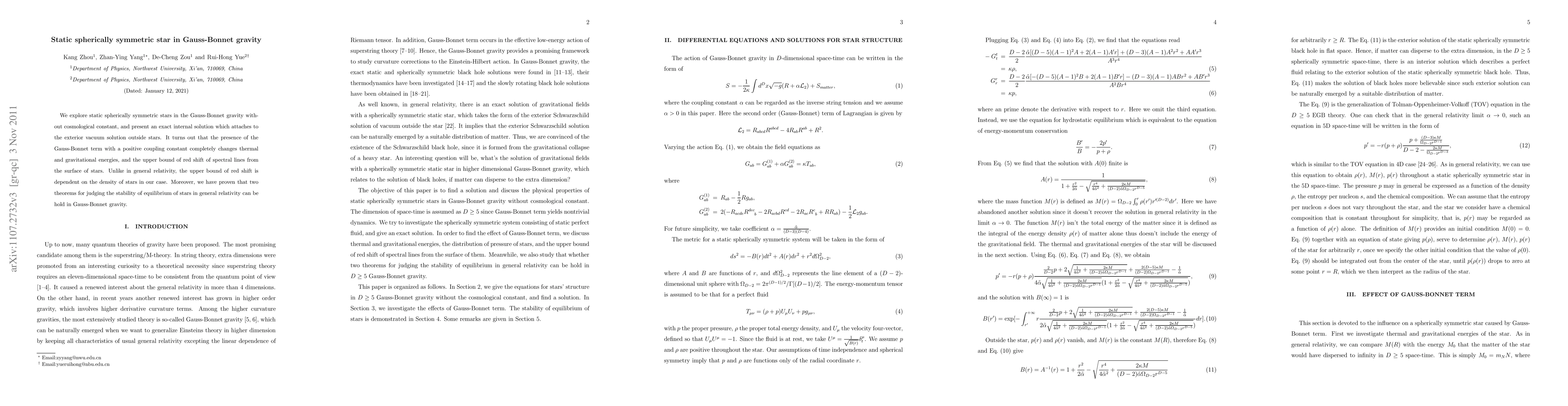 This paper investigates static spherically symmetric stars in Gauss-Bonnet gravity, presenting an exact internal solution that connects to the exterior vacuum solution. The Gauss-Bonnet term alters thermal and gravitational energies, and the upper bound of spectral line redshift depends on star density, differing from general relativity.