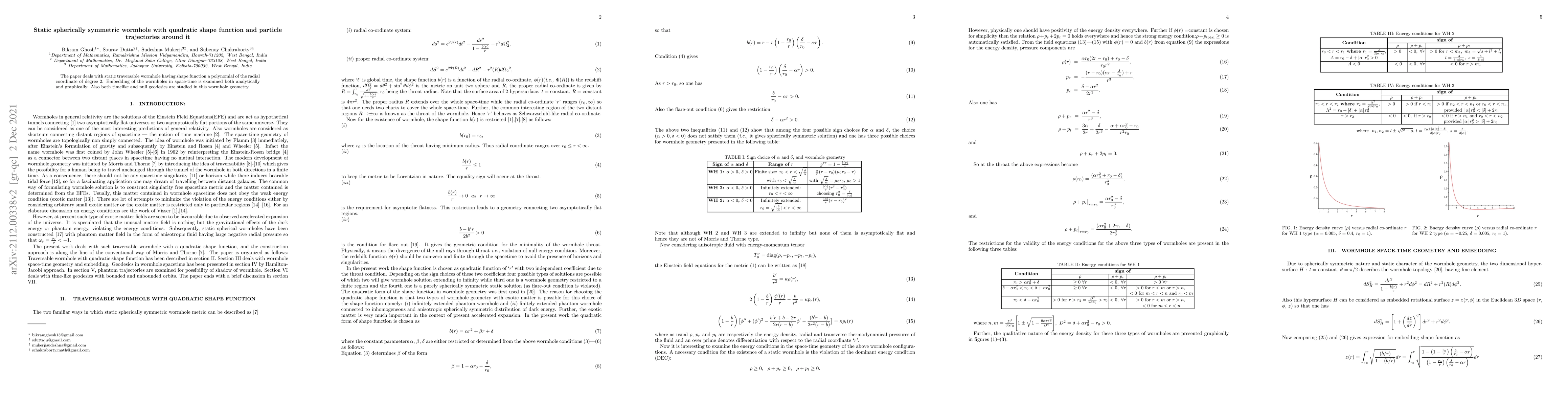 Summary: This paper investigates a static spherically symmetric wormhole with a quadratic shape function, analyzing its embedding in space-time and examining both timelike and null geodesics around it through analytical and graphical methods.