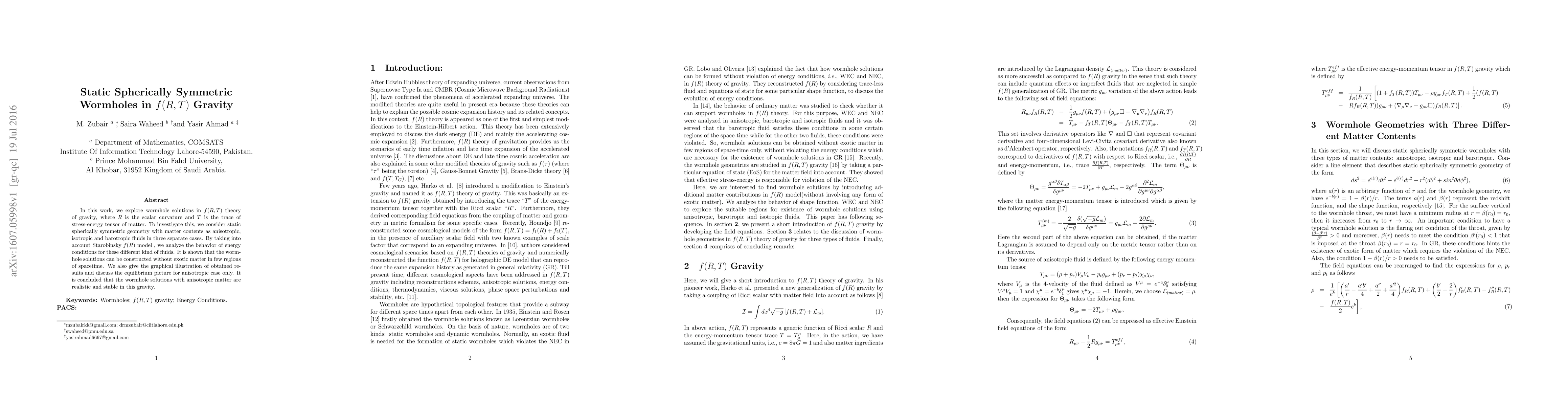 This paper investigates static spherically symmetric wormholes in $f(R,T)$ gravity, finding that wormhole solutions can exist without exotic matter in some regions. It concludes that wormholes with anisotropic matter are realistic and stable under these conditions.