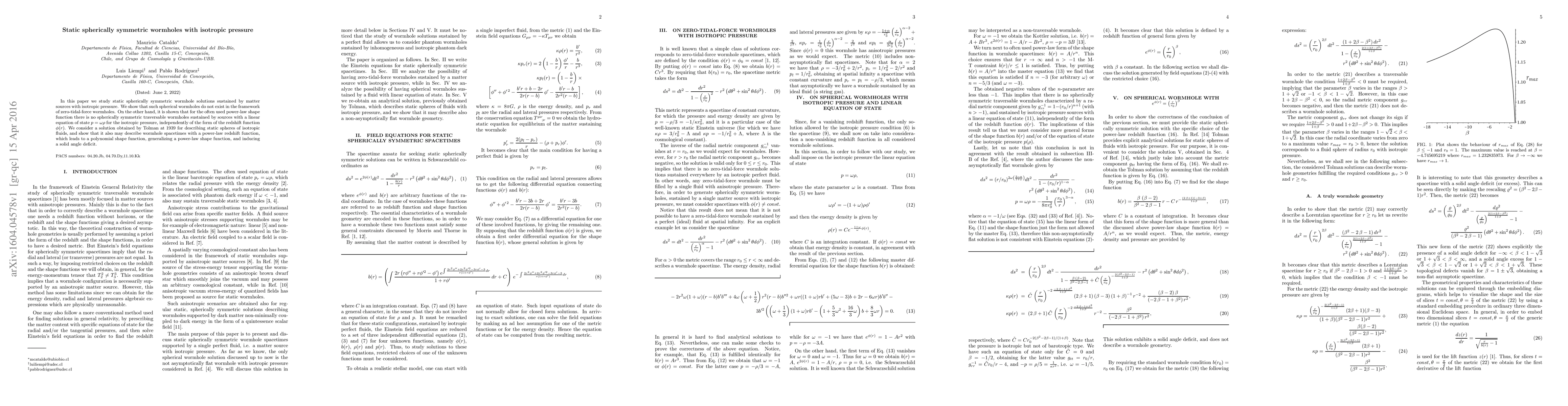 This paper investigates static spherically symmetric wormholes maintained by isotropic pressure but finds no such wormholes under zero-tidal-force conditions. It concludes that power-law shape functions cannot sustain traversable spherical wormholes with linear equations of state, while a Tolman 1939 solution describes wormhole spacetimes with a generalized power-law redshift function and solid angle deficit.