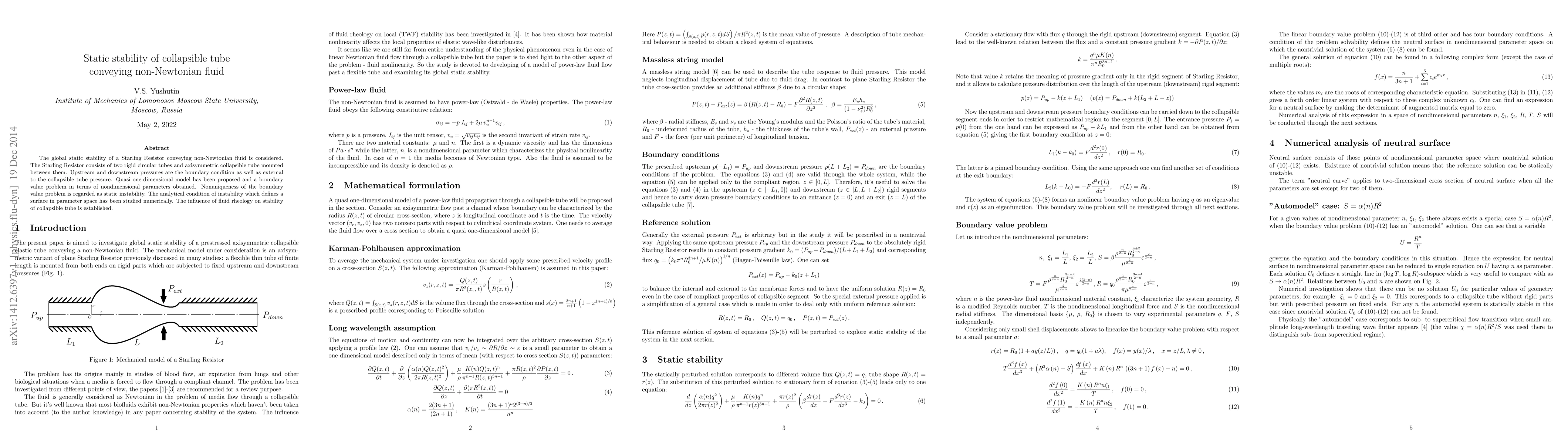 The global static stability of a Starling Resistor conveying non-Newtonian fluid is considered. The Starling Resistor consists of two rigid circular tubes and axisymmetric collapsible tube mounted between them. Upstream and downstream pressures are the boundary condition as well as external to the collapsible tube pressure. Quasi one-dimensional model has been proposed and a boundary value problem in terms of nondimensional parameters obtained. Nonuniqueness of the boundary value problem is regarded as static instability. The analytical condition of instability which defines a surface in parameter space has been studied numerically. The influence of fluid rheology on stability of collapsible tube is established.