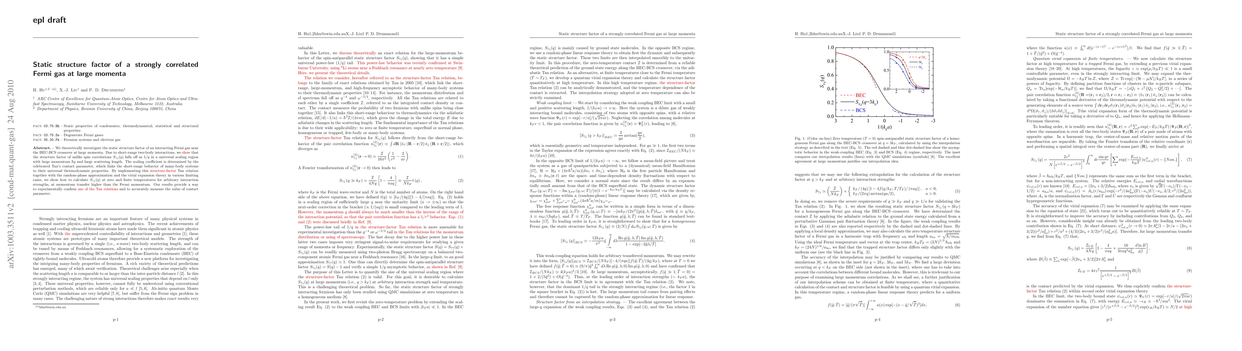 We theoretically investigate the static structure factor of an interacting Fermi gas near the BEC-BCS crossover at large momenta. Due to short-range two-body interactions, we predict that the structure factor of unlike spin correlations $S_{\uparrow\downarrow}(q)$ falls off as $1/q$ in a universal scaling region with large momentum $\hbar q$ and large scattering length. The scaling coefficient is determined by the celebrated Tan's contact parameter, which links the short-range behavior of many-body systems to their universal thermodynamic properties. By implementing this new Tan relation together with the random-phase approximation and the virial expansion theory in various limiting cases, we show how to calculate $S_{\uparrow\downarrow}(q)$ at zero and finite temperatures for arbitrary interaction strengths, at momentum transfer higher than the Fermi momentum. Our results provide a way to experimentally confirm a new Tan relation and to accurately measure the value of contact parameter.