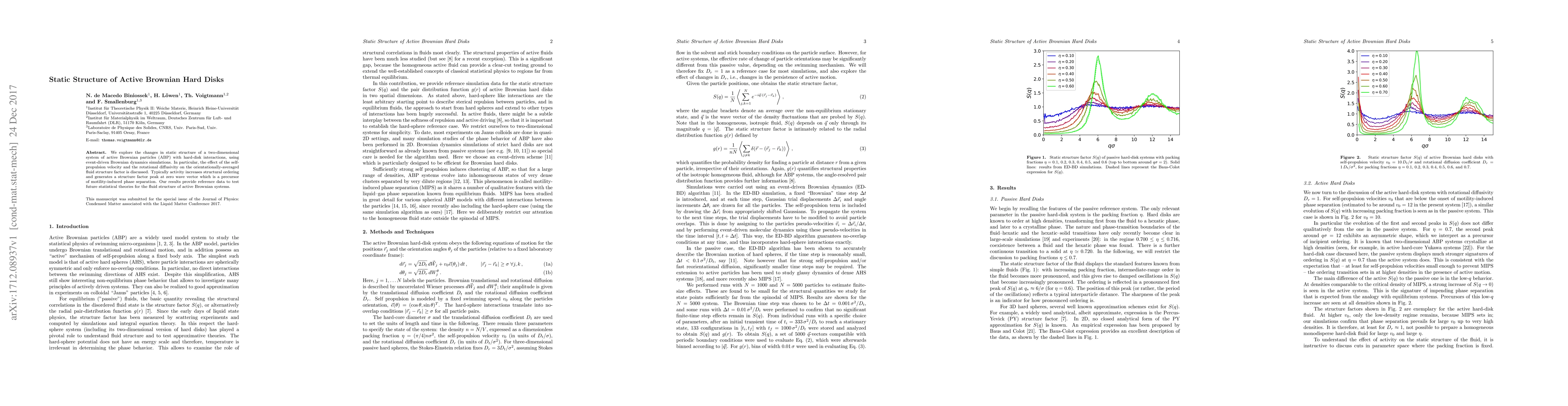 This paper investigates the static structure of active Brownian hard disks using simulations, finding that increased activity enhances structural ordering and generates a peak in the fluid structure factor, which precedes phase separation. The study provides foundational data for future theories on active Brownian systems.