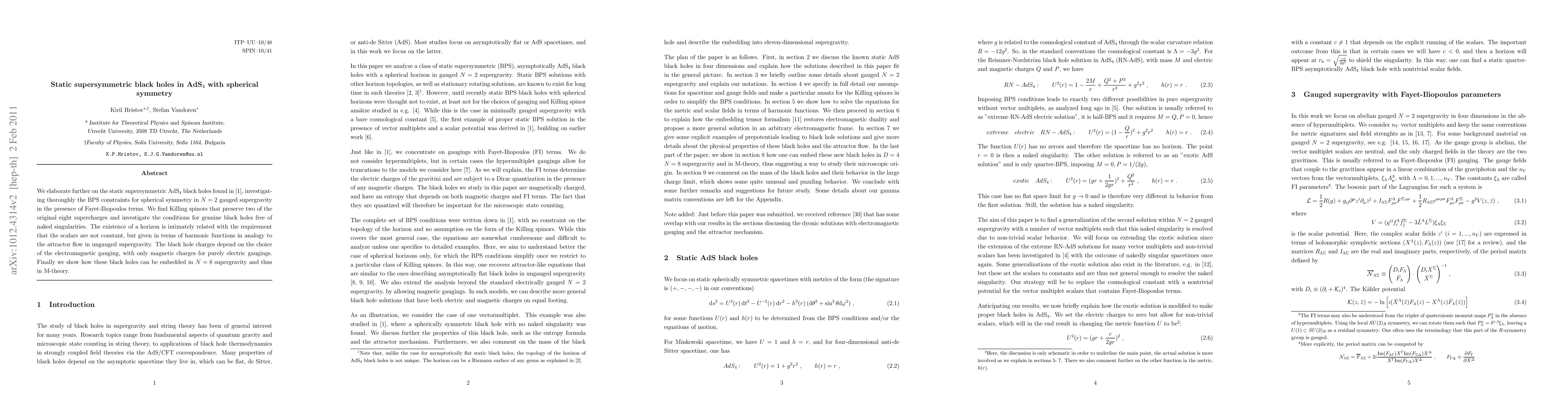 This paper explores static supersymmetric black holes in AdS_4 with spherical symmetry, focusing on BPS constraints in N = 2 gauged supergravity. It identifies Killing spinors preserving two supercharges and discusses conditions for genuine black holes, showing their embedding in N = 8 supergravity and M-theory.