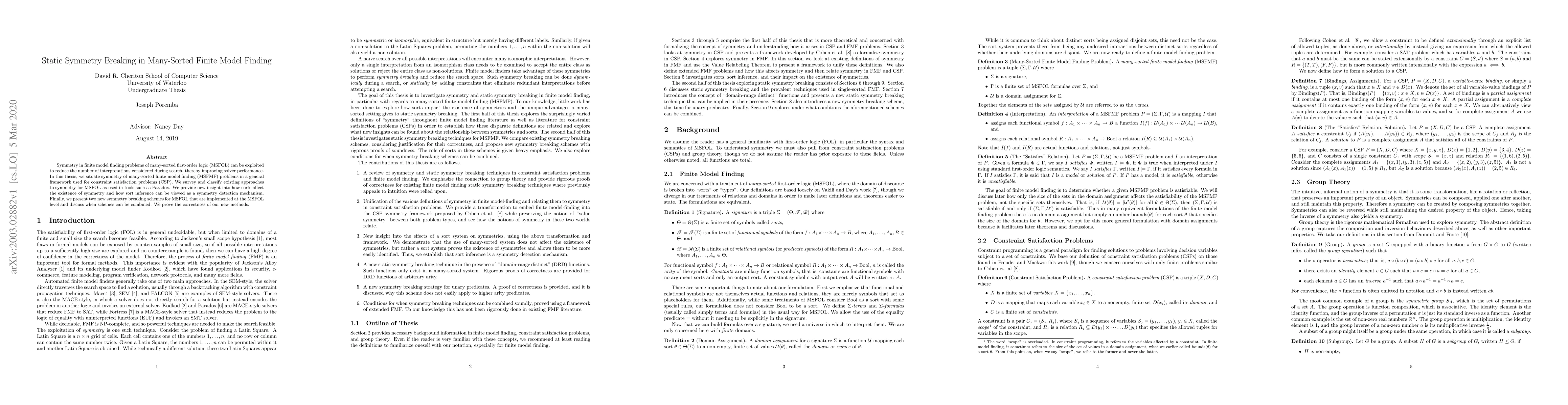 Symmetry in finite model finding problems of many-sorted first-order logic (MSFOL) can be exploited to reduce the number of interpretations considered during search, thereby improving solver performance. In this thesis, we situate symmetry of many-sorted finite model finding (MSFMF) problems in a general framework used for constraint satisfaction problems (CSP). We survey and classify existing approaches to symmetry for MSFOL as used in tools such as Paradox. We provide new insight into how sorts affect the existence of symmetry and how sort inference can be viewed as a symmetry detection mechanism. Finally, we present two new symmetry breaking schemes for MSFOL that are implemented at the MSFOL level and discuss when schemes can be combined. We prove the correctness of our new methods.