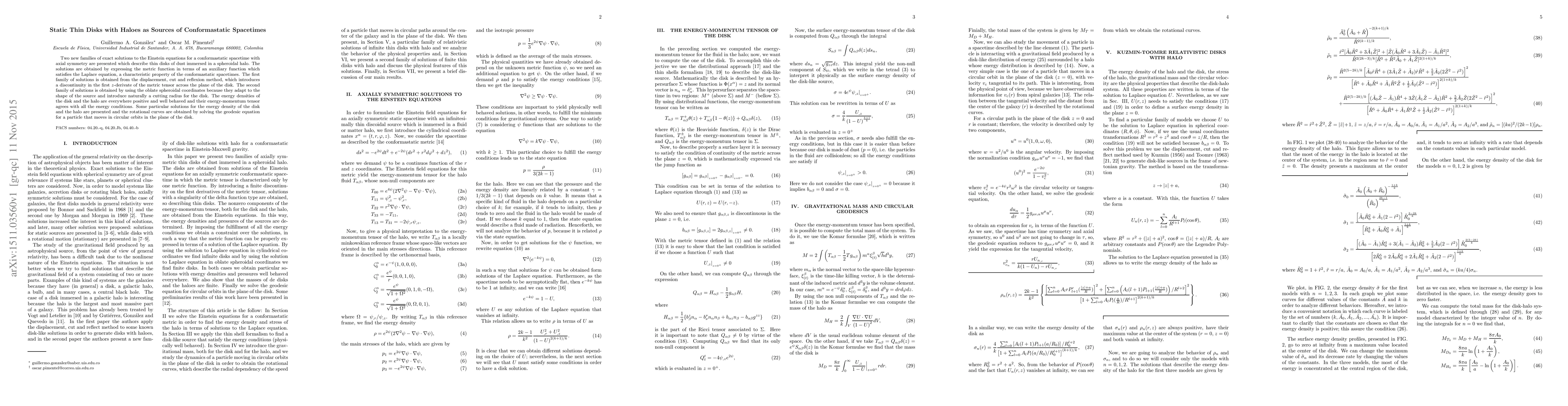 This paper presents two families of exact solutions for conformastatic spacetimes describing thin dust disks embedded in spheroidal halos, obtained through different mathematical methods. Both solutions maintain positive energy densities and satisfy energy conditions, with rotational curves derived from geodesic equations.