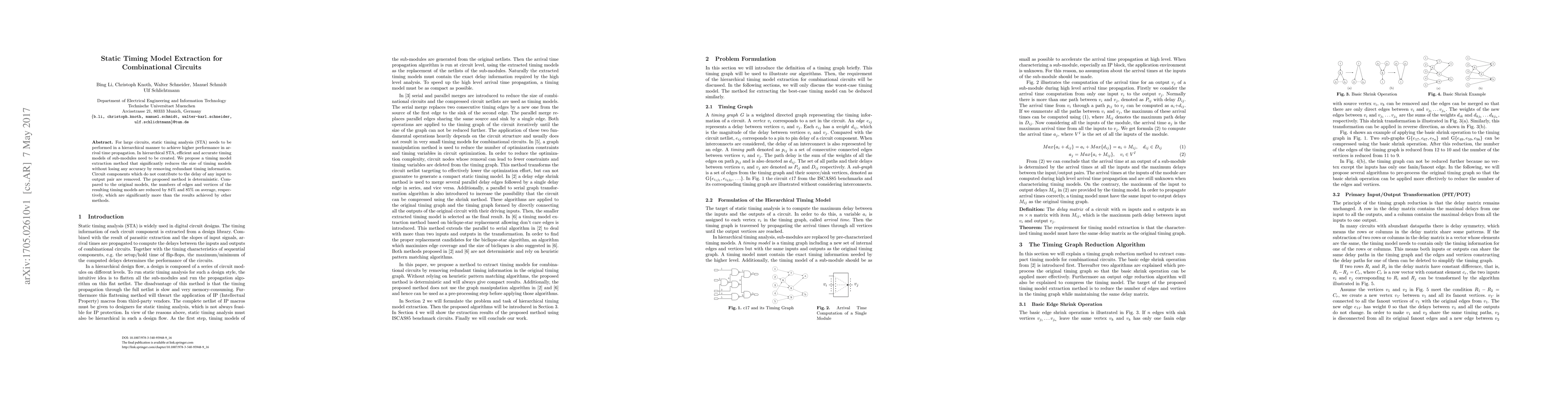 This paper proposes a method for extracting efficient static timing models for large combinational circuits by removing redundant timing information, significantly reducing model size while maintaining accuracy. The method deterministically removes non-contributing circuit components, achieving an average reduction of 84% in edges and 85% in vertices compared to original models.