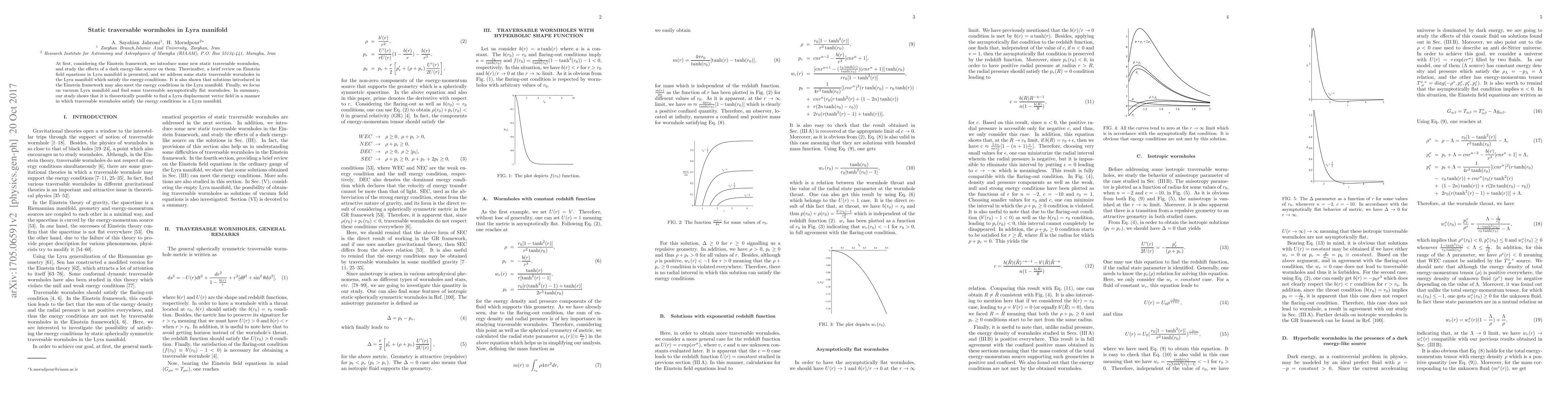 This paper explores static traversable wormholes within the framework of the Einstein field equations and the Lyra manifold, demonstrating that these wormholes can satisfy energy conditions. It also identifies traversable wormholes in a vacuum Lyra manifold, concluding that traversable wormholes can theoretically exist under these conditions.