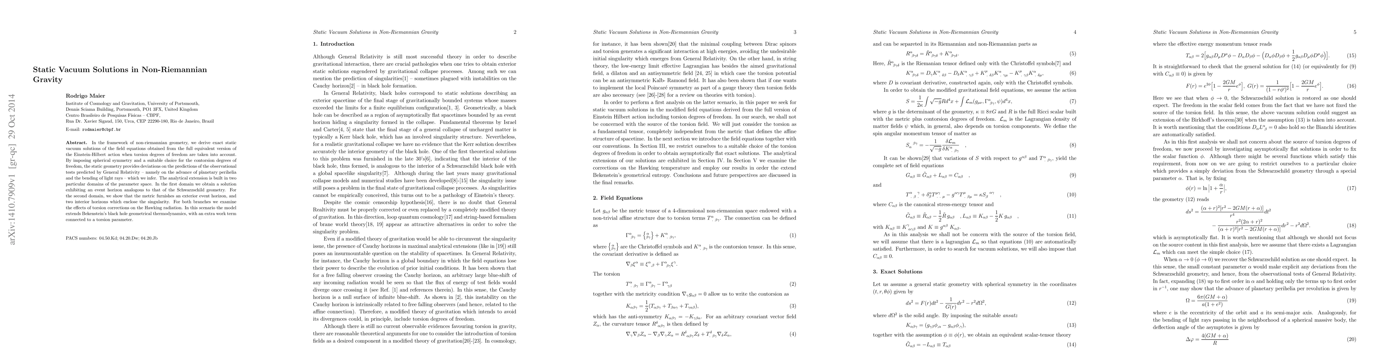 In the framework of non-riemannian geometry, we derive exact static vacuum solutions of the field equations obtained from the full equivalent version of the Einstein-Hilbert action when torsion degrees of freedom are taken into account. By imposing spherical symmetry and a suitable choice for the contorsion degrees of freedom, the static geometry provides deviations on the predictions of the observational tests predicted by General Relativity -- namely on the advance of planetary perihelia and the bending of light rays -- which we infer. The analytical extension is built in two particular domains of the parameter space. In the first domain we obtain a solution exhibiting an event horizon analogous to that of the Schwarzschild geometry. For the second domain, we show that the metric furnishes an exterior event horizon, and two interior horizons which enclose the singularity. For both branches we examine the effects of torsion corrections on the Hawking radiation. In this scenario the model extends Bekenstein's black hole geometrical thermodynamics, with an extra work term connected to a torsion parameter.