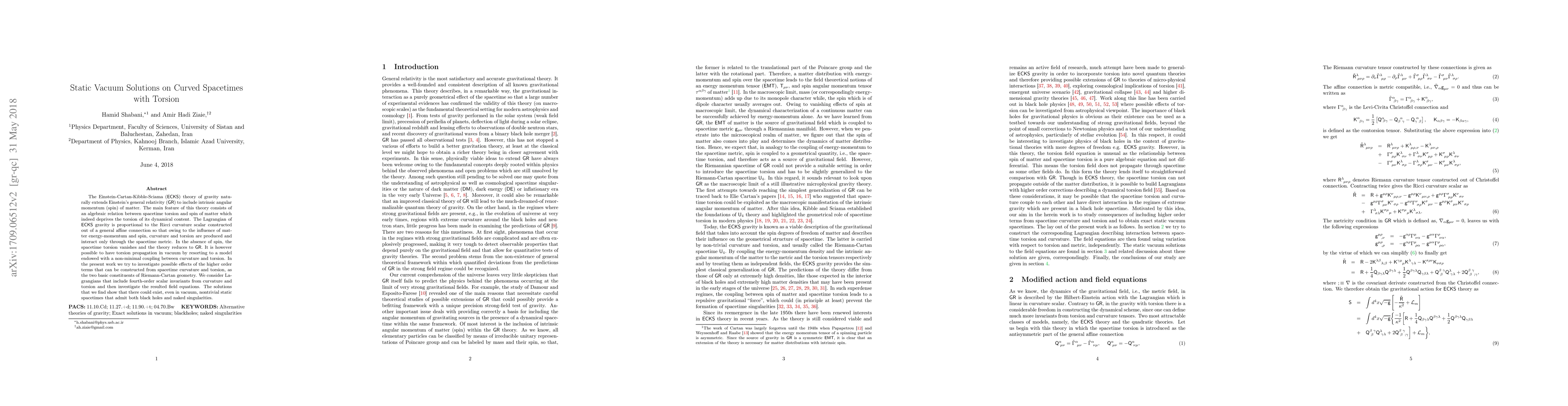 This paper explores static vacuum solutions in the Einstein-Cartan-Kibble-Sciama (ECKS) theory, which extends general relativity to include matter's intrinsic angular momentum. The study investigates higher-order terms in the Lagrangian involving curvature and torsion and finds nontrivial static spacetimes that can host black holes and naked singularities.