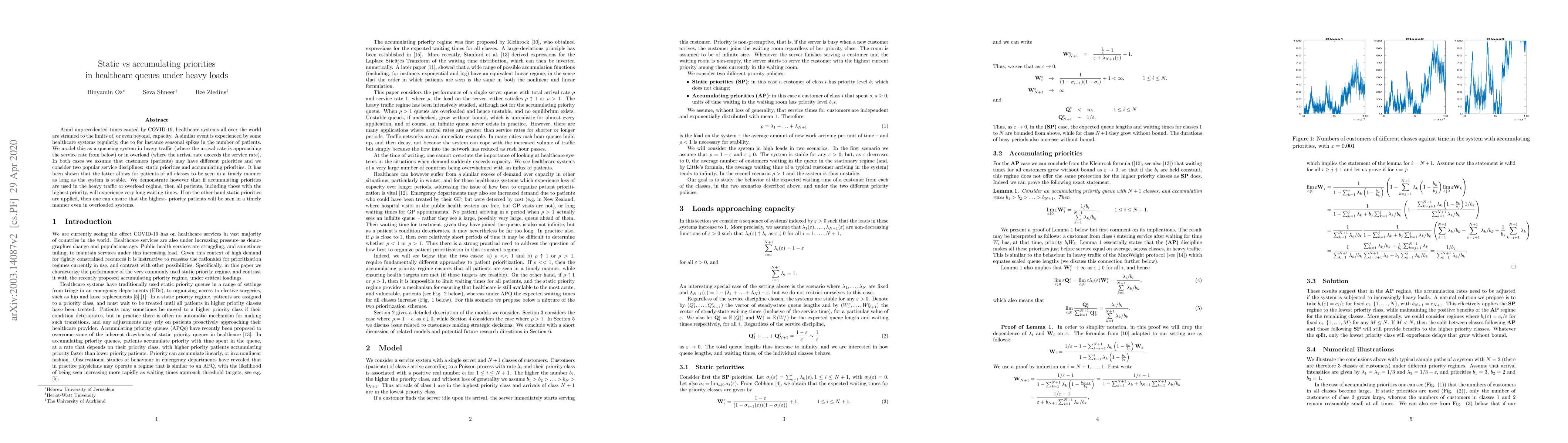 Amid unprecedented times caused by COVID-19, healthcare systems all over the world are strained to the limits of, or even beyond, capacity. A similar event is experienced by some healthcare systems regularly, due to for instance seasonal spikes in the number of patients. We model this as a queueing system in heavy traffic (where the arrival rate is approaching the service rate from below) or in overload (where the arrival rate exceeds the service rate). In both cases we assume that customers (patients) may have different priorities and we consider two popular service disciplines: static priorities and accumulating priorities. It has been shown that the latter allows for patients of all classes to be seen in a timely manner as long as the system is stable. We demonstrate however that if accumulating priorities are used in the heavy traffic or overload regime, then all patients, including those with the highest priority, will experience very long waiting times. If on the other hand static priorities are applied, then one can ensure that the highest-priority patients will be seen in a timely manner even in overloaded systems.