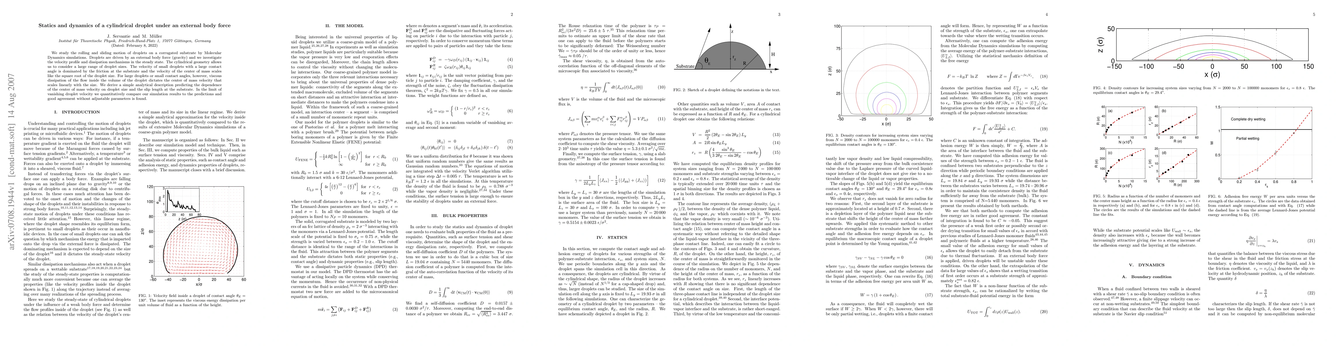 We study the rolling and sliding motion of droplets on a corrugated substrate by Molecular Dynamics simulations. Droplets are driven by an external body force (gravity) and we investigate the velocity profile and dissipation mechanisms in the steady state. The cylindrical geometry allows us to consider a large range of droplet sizes. The velocity of small droplets with a large contact angle is dominated by the friction at the substrate and the velocity of the center of mass scales like the square root of the droplet size. For large droplets or small contact angles, however, viscous dissipation of the flow inside the volume of the droplet dictates the center of mass velocity that scales linearly with the size. We derive a simple analytical description predicting the dependence of the center of mass velocity on droplet size and the slip length at the substrate. In the limit of vanishing droplet velocity we quantitatively compare our simulation results to the predictions and good agreement without adjustable parameters is found.