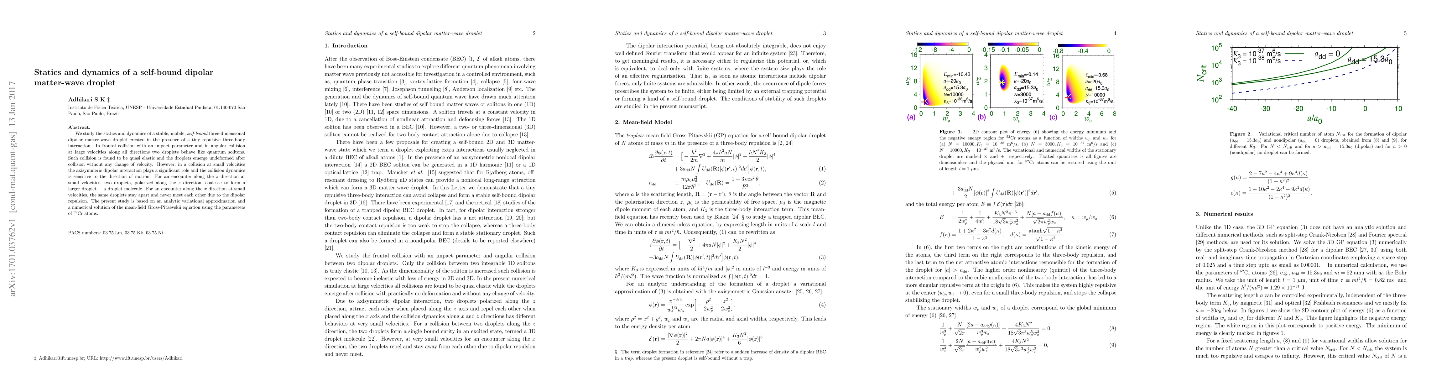 This paper investigates the statics and dynamics of self-bound dipolar matter-wave droplets, revealing quasi-elastic collisions behaving like quantum solitons at high velocities. At low velocities, collisions are direction-dependent, leading to coalescence along the z-axis or repulsion along the x-axis due to dipolar interactions.