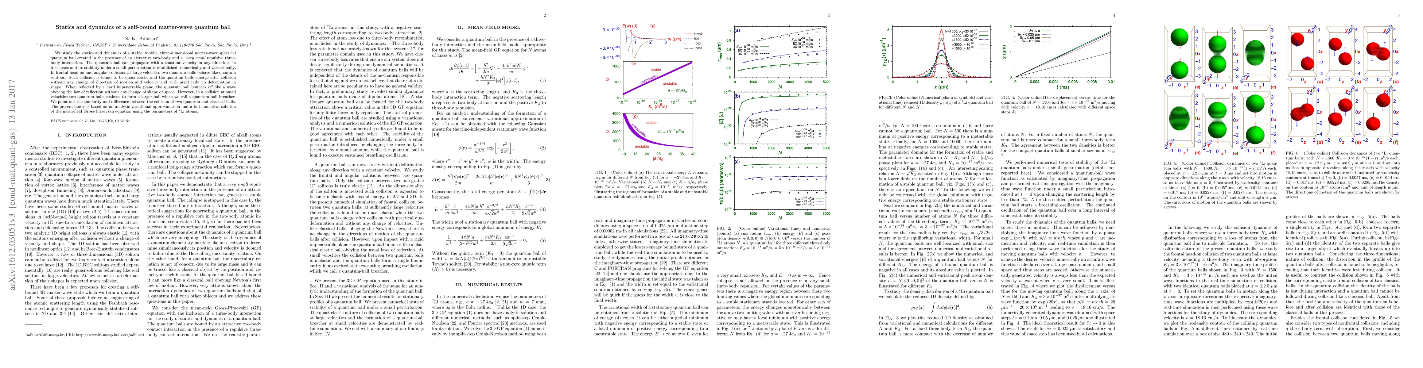 We study the statics and dynamics of a stable, mobile, three-dimensional matter-wave spherical quantum ball created in the presence of an attractive two-body and a very small repulsive three-body interaction. The quantum ball can propagate with a constant velocity in any direction in free space and its stability under a small perturbation is established numerically and variationally. In frontal head-on and angular collisions at large velocities two quantum balls behave like quantum solitons. Such collision is found to be quasi elastic and the quantum balls emerge after collision without any change of direction of motion and velocity and with practically no deformation in shape. When reflected by a hard impenetrable plane, the quantum ball bounces off like a wave obeying the law of reflection without any change of shape or speed. However, in a collision at small velocities two quantum balls coalesce to form a larger ball which we call a quantum-ball breather. We point out the similarity and difference between the collision of two quantum and classical balls. The present study is based on an analytic variational approximation and a full numerical solution of the mean-field Gross-Pitaevskii equation using the parameters of $^7$Li atoms.