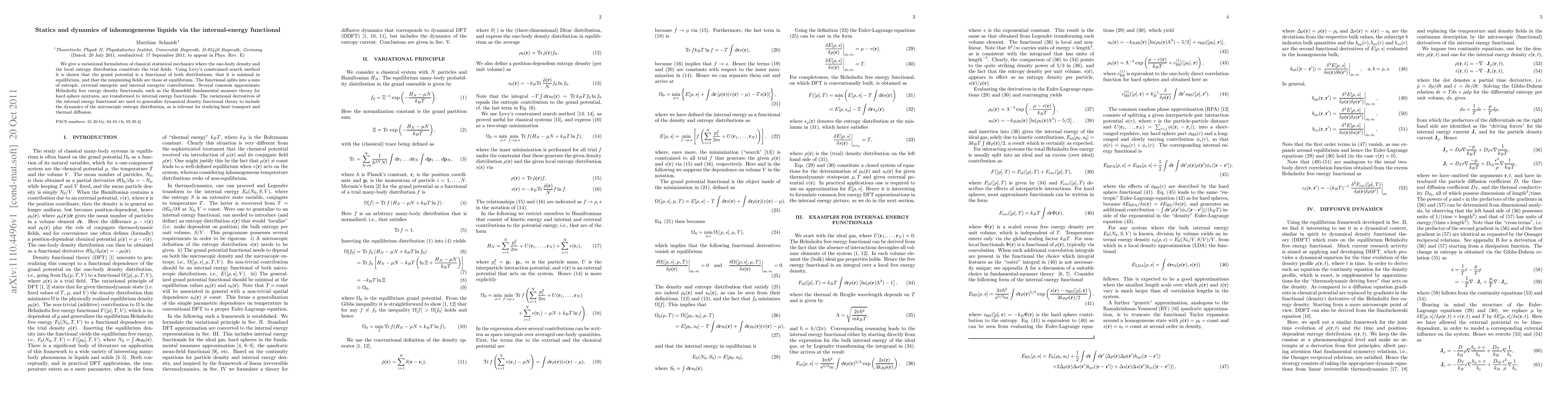 We give a variational formulation of classical statistical mechanics where the one-body density and the local entropy distribution constitute the trial fields. Using Levy's constrained search method it is shown that the grand potential is a functional of both distributions, that it is minimal in equilibrium, and that the minimizing fields are those at equilibrium. The functional splits into a sum of entropic, external energetic and internal energetic contributions. Several common approximate Helmholtz free energy density functionals, such as the Rosenfeld fundamental measure theory for hard sphere mixtures, are transformed to internal energy functionals. The variational derivatives of the internal energy functional are used to generalize dynamical density functional theory to include the dynamics of the microscopic entropy distribution, as is relevant for studying heat transport and thermal diffusion.