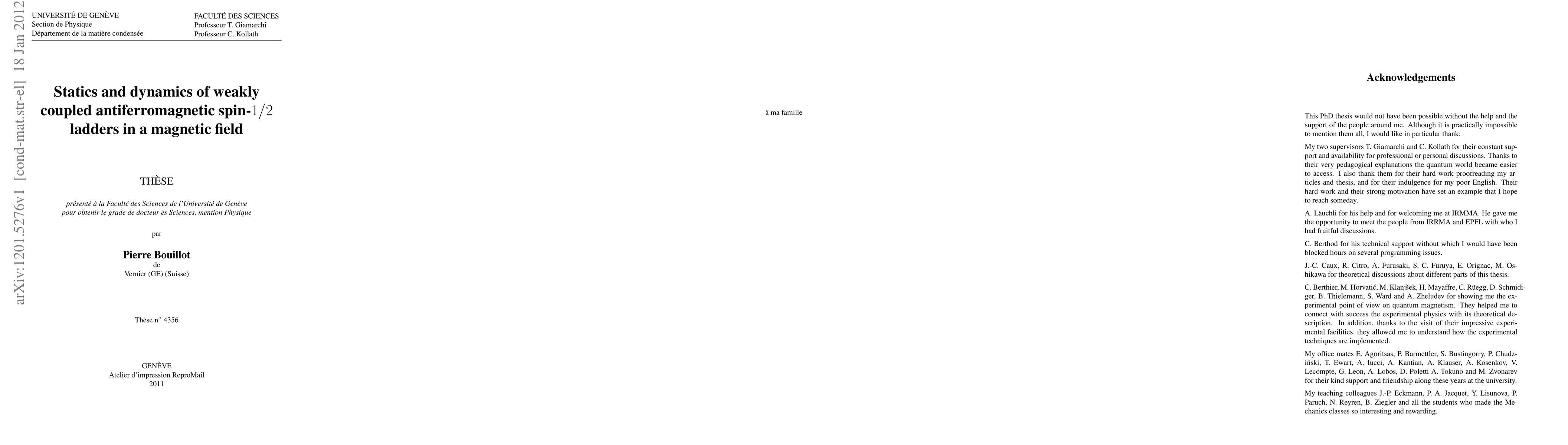 This research explores the statics and dynamics of weakly coupled spin-1/2 ladders in a magnetic field using numerical and analytical methods, particularly the DMRG technique. It provides detailed results on magnetization, specific heat, and NMR relaxation, and predicts the transition temperature for triplet condensation in coupled ladders, comparing theoretical findings with experimental data from BPCB.