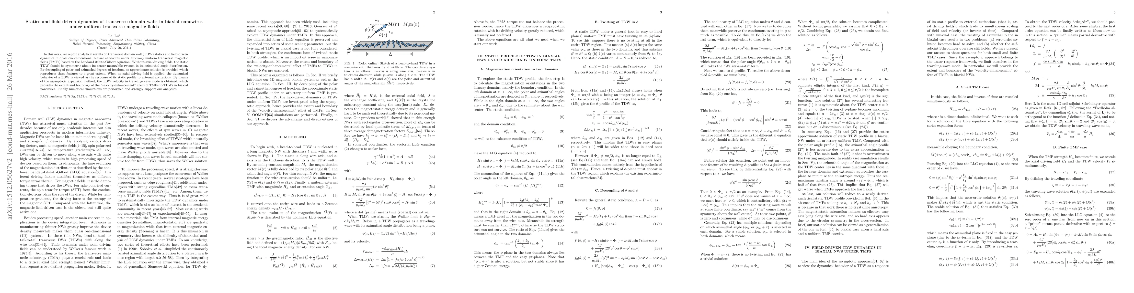 This paper presents an analytical study on the statics and field-driven dynamics of transverse domain walls in biaxial nanowires under uniform transverse magnetic fields, revealing the symmetry and twisting of static walls and the velocity enhancement effect of magnetic fields on dynamic wall motion, supported by numerical simulations.