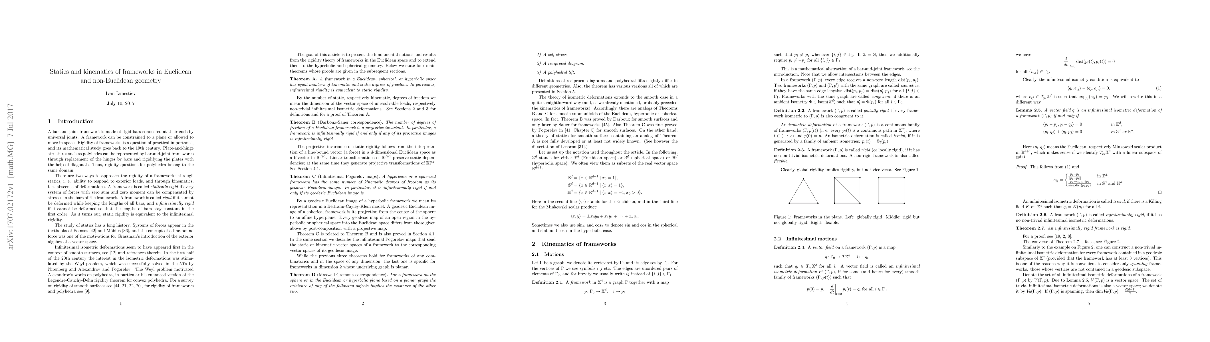 This is a survey article on the infinitesimal rigidity of frameworks in Euclidean, hyperbolic, and spherical geometry. We discuss the equivalence of the static and kinematic formulations of the infinitesimal rigidity, the projective interpretation of statics (representing forces as bivectors), and the infinitesimal Pogorelov maps that establish correspondence between infinitesimal motions of a framework and of its geodesic image. Also we describe the Maxwell-Cremona correspondence between equilibrium loads and polyhedral lifts, both for Euclidean and for non-Euclidean frameworks.