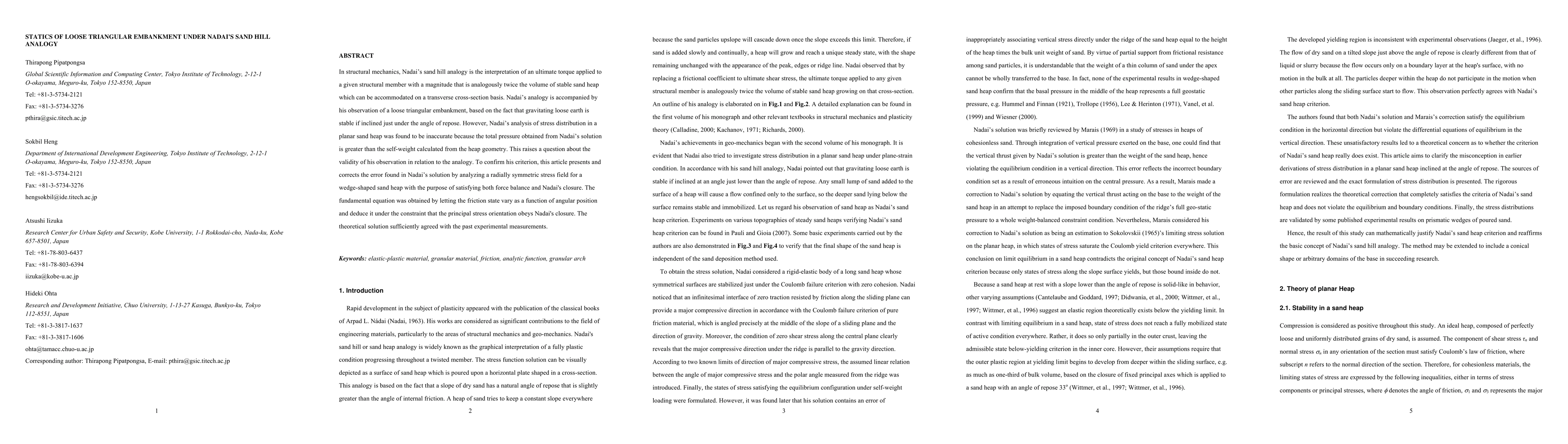 In structural mechanics, Nadai's sand hill analogy is the interpretation of an ultimate torque applied to a given structural member with a magnitude that is analogously twice the volume of stable sand heap which can be accommodated on a transverse cross-section basis. Nadai's analogy is accompanied by his observation of a loose triangular embankment, based on the fact that gravitating loose earth is stable if inclined just under the angle of repose. However, Nadai's analysis of stress distribution in a planar sand heap was found to be inaccurate because the total pressure obtained from Nadai's solution is greater than the self-weight calculated from the heap geometry. This raises a question about the validity of his observation in relation to the analogy. To confirm his criterion, this article presents and corrects the error found in Nadai's solution by analyzing a radially symmetric stress field for a wedge-shaped sand heap with the purpose of satisfying both force balance and Nadai's closure. The fundamental equation was obtained by letting the friction state vary as a function of angular position and deduce it under the constraint that the principal stress orientation obeys Nadai's closure. The theoretical solution sufficiently agreed with the past experimental measurements.