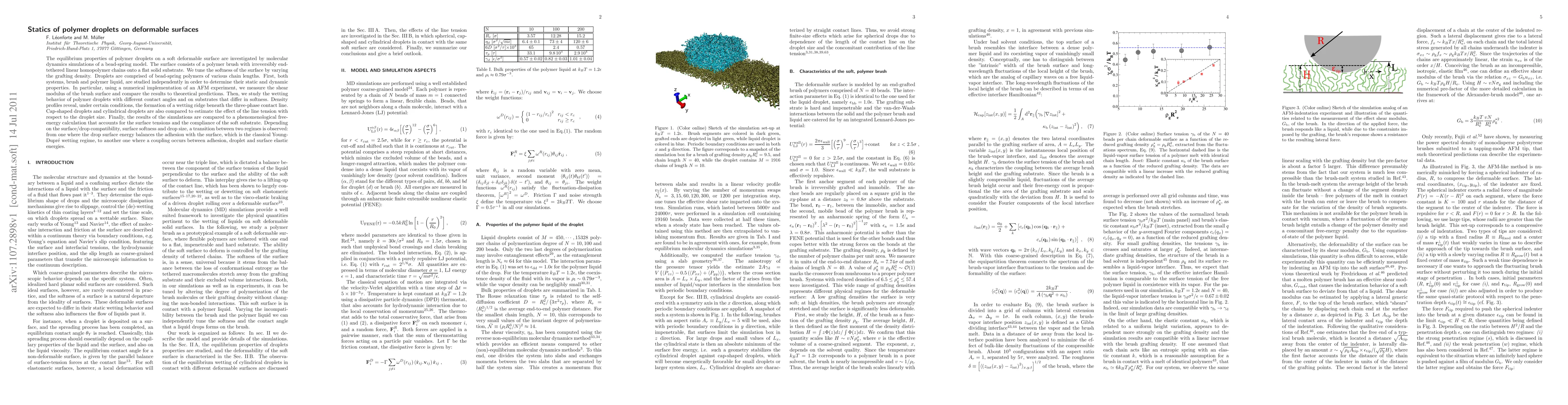 This paper investigates the equilibrium properties of polymer droplets on deformable surfaces using molecular dynamics simulations. It finds that the wetting behavior and droplet shape depend on the surface softness and droplet size, transitioning from a classical Young-Dupré regime to a regime where adhesion and elastic energies couple.