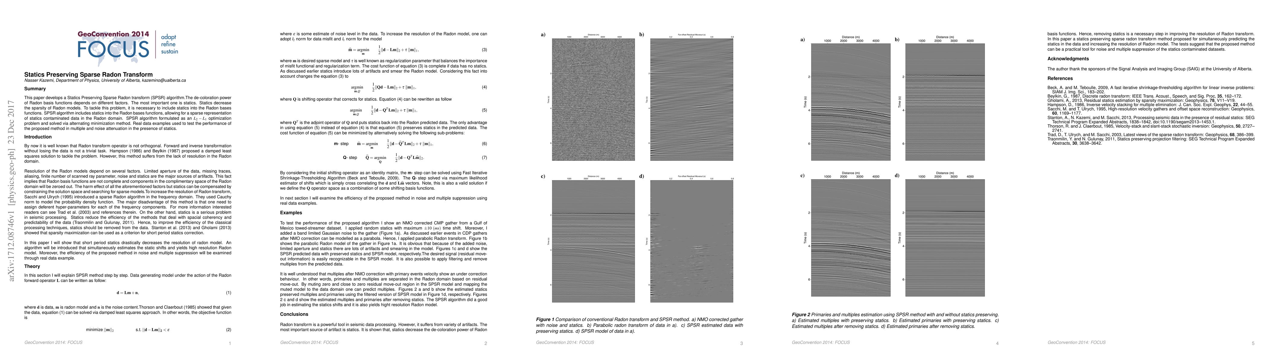 This paper introduces the Statics Preserving Sparse Radon transform (SPSR) algorithm to address the issue of statics reducing the sparsity of Radon models. The SPSR algorithm incorporates statics into Radon basis functions, enabling sparse representation of statics-contaminated data, and is solved via an $L_2- L_1$ optimization using alternating minimization, with real data demonstrating its effectiveness in multiple and noise attenuation.