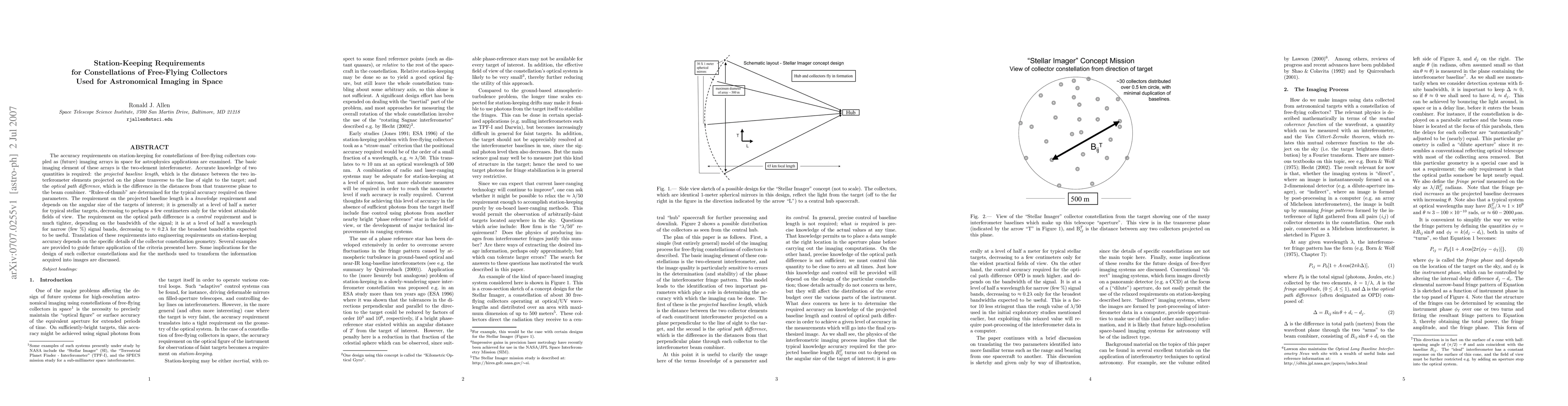 This paper examines the station-keeping accuracy requirements for constellations of free-flying collectors used in space for astronomical imaging. It determines that the projected baseline length and optical path difference must be accurately controlled, with typical requirements ranging from half a meter to a few centimeters and from half a wavelength to 0.2 lambda, respectively.