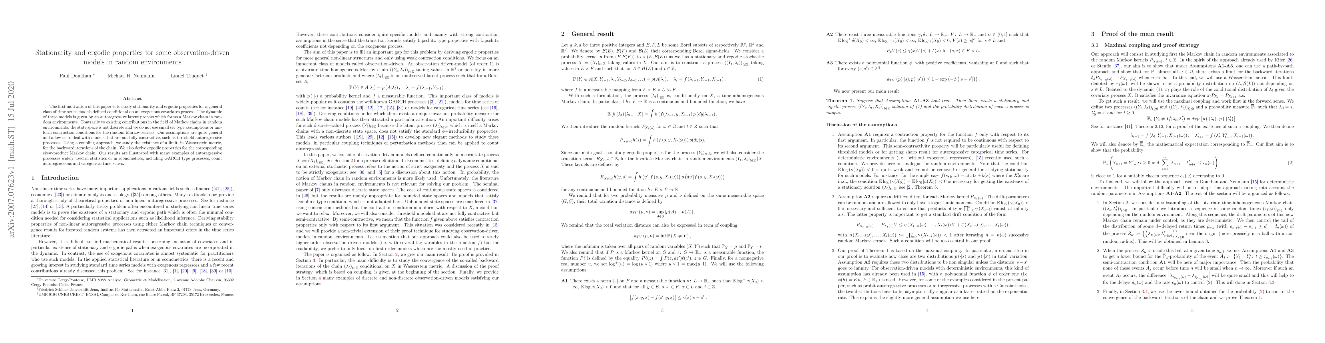 This paper investigates stationarity and ergodic properties for a broad class of observation-driven time series models in random environments, utilizing a coupling approach to establish existence of limits and derive ergodic properties for these models, exemplified by GARCH, count autoregressions, and categorical series.