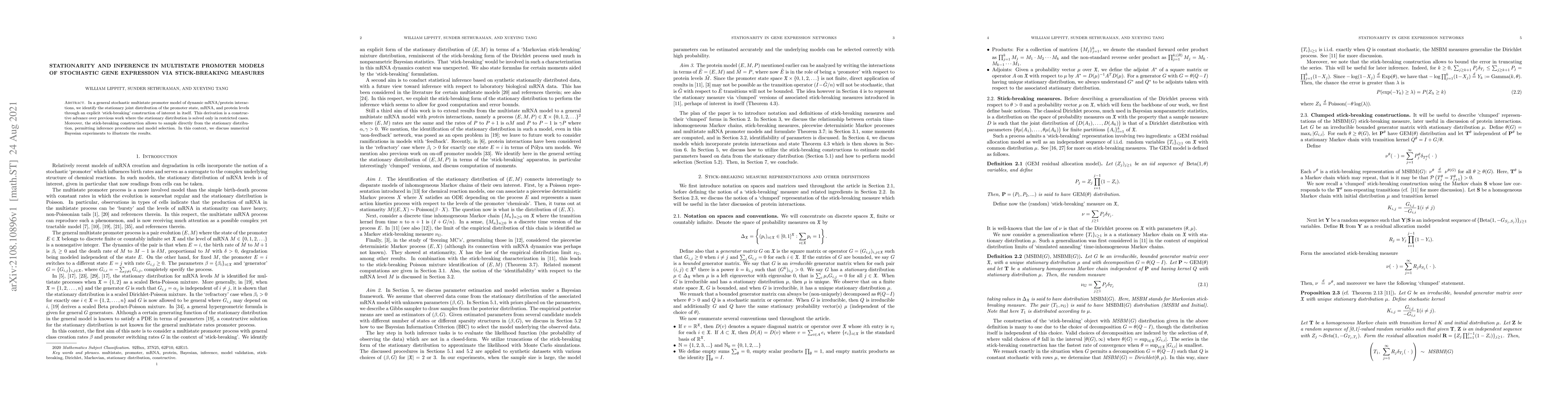 The paper presents a multistate promoter model of stochastic gene expression, deriving the stationary joint distribution via a stick-breaking construction. This construction allows for direct sampling from the stationary distribution, facilitating inference procedures and model selection.