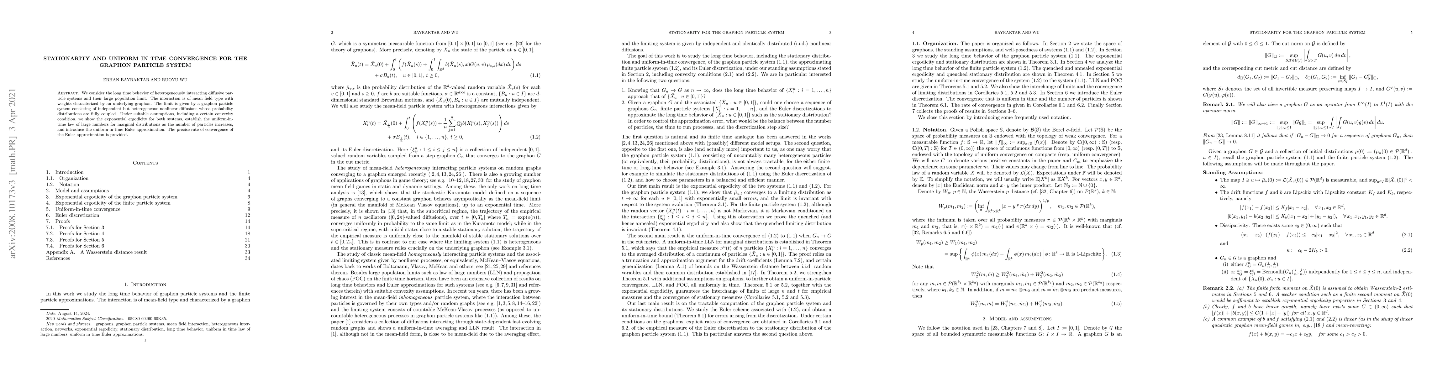 The paper presents detailed proofs of stationarity and uniform-in-time convergence for graphon particle systems, introducing novel techniques for analyzing mean-field limits under dynamic graph structures.