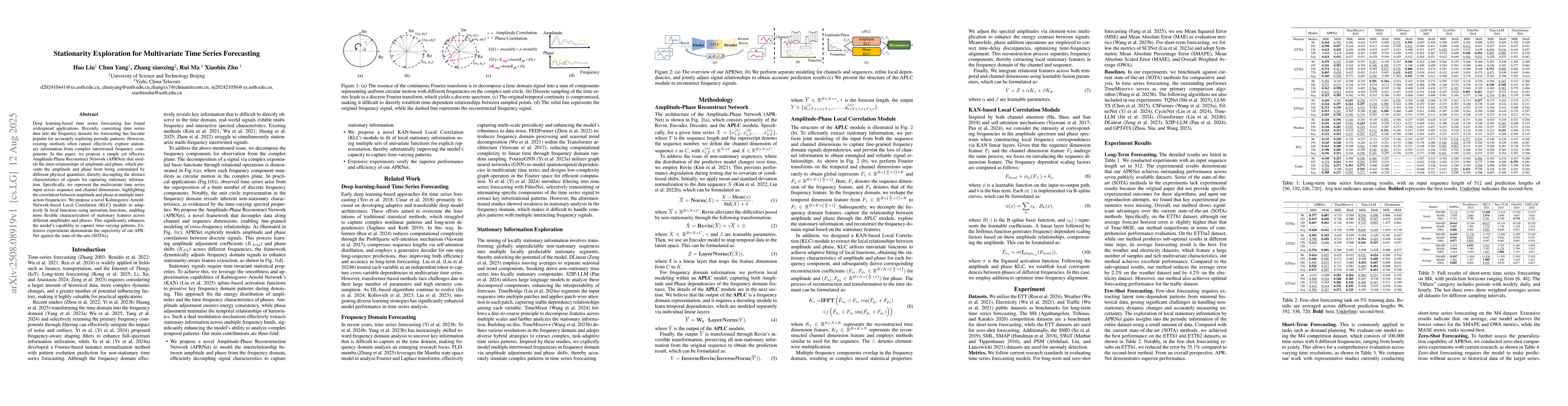 Deep learning-based time series forecasting has found widespread applications. Recently, converting time series data into the frequency domain for forecasting has become popular for accurately exploring periodic patterns. However, existing methods often cannot effectively explore stationary information from complex intertwined frequency components. In this paper, we propose a simple yet effective Amplitude-Phase Reconstruct Network (APRNet) that models the inter-relationships of amplitude and phase, which prevents the amplitude and phase from being constrained by different physical quantities, thereby decoupling the distinct characteristics of signals for capturing stationary information. Specifically, we represent the multivariate time series input across sequence and channel dimensions, highlighting the correlation between amplitude and phase at multiple interaction frequencies. We propose a novel Kolmogorov-Arnold-Network-based Local Correlation (KLC) module to adaptively fit local functions using univariate functions, enabling more flexible characterization of stationary features across different amplitudes and phases. This significantly enhances the model's capability to capture time-varying patterns. Extensive experiments demonstrate the superiority of our APRNet against the state-of-the-arts (SOTAs).