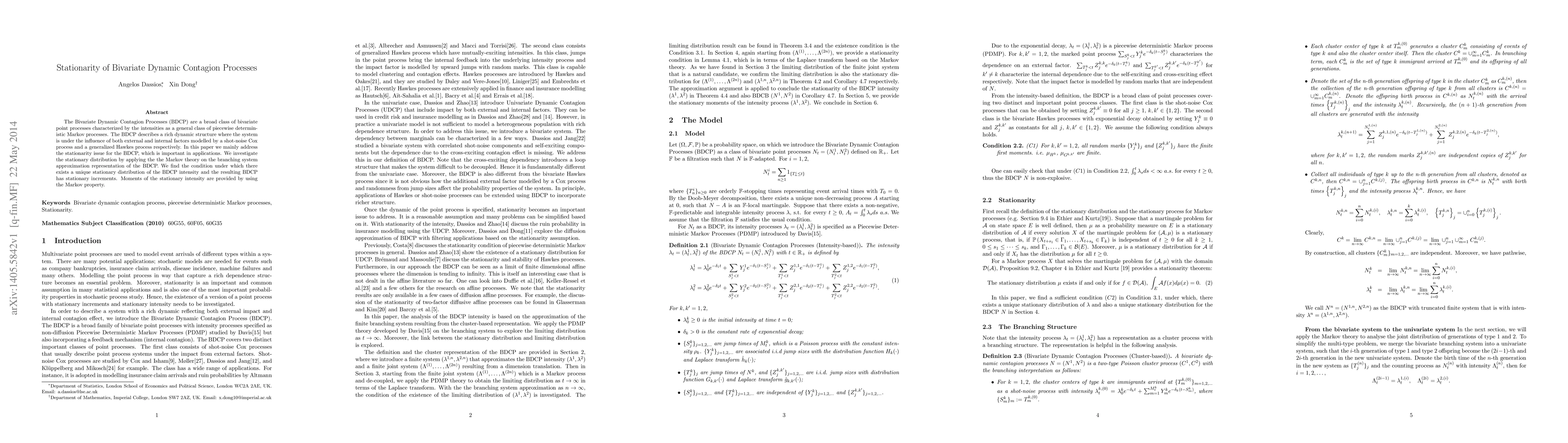 This paper investigates the stationarity of Bivariate Dynamic Contagion Processes (BDCP), which are modeled as a combination of shot-noise Cox and generalized Hawkes processes. The authors apply Markov theory on the branching system approximation to determine conditions for a unique stationary distribution and stationary increments, providing moments of the stationary intensity through the Markov property.
