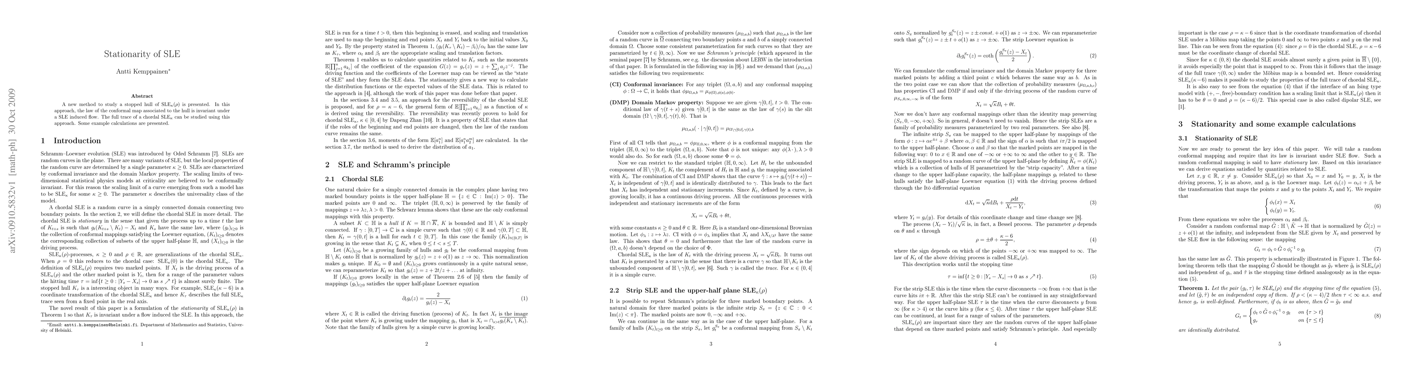 The paper formulates the stationarity of SLEκ(ρ) as the stationarity of the law of a stopped hull under an SLE-induced flow, directly involving the full SLE trace.