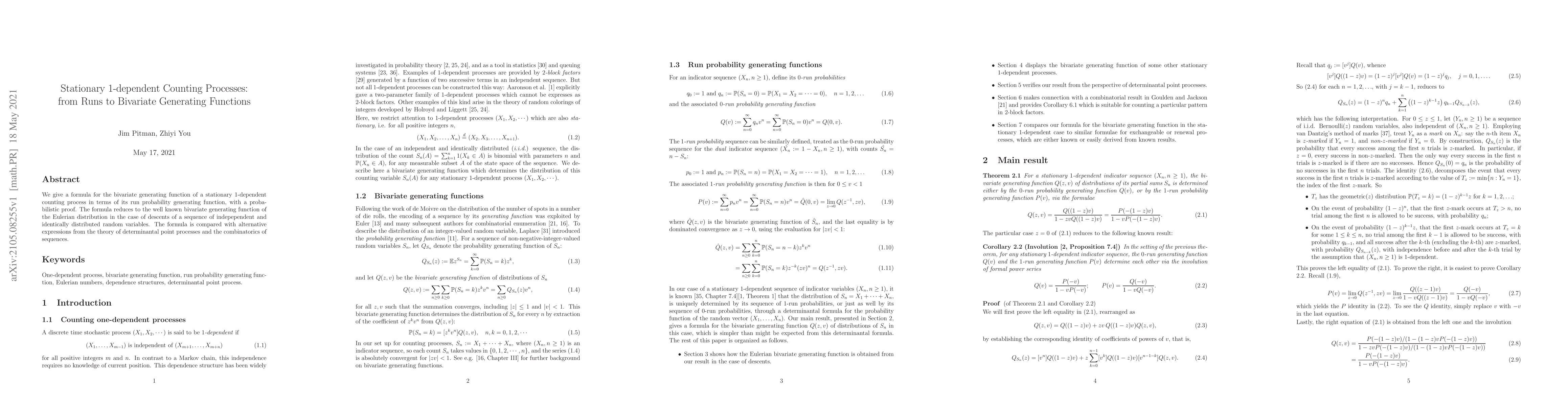 Researchers developed a formula to calculate the bivariate generating function of stationary 1-dependent counting processes in terms of their run probability generating function. The formula simplifies to the well-known generating function for descents of independent random variables.