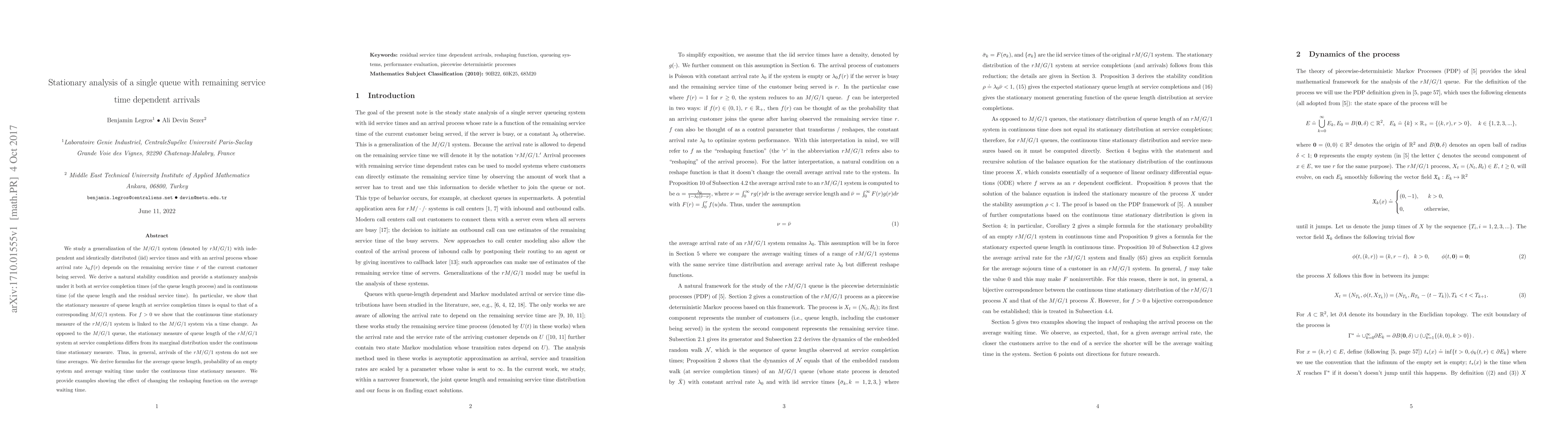 We study a generalization of the $M/G/1$ system (denoted by $rM/G/1$) with independent and identically distributed (iid) service times and with an arrival process whose arrival rate $\lambda_0f(r)$ depends on the remaining service time $r$ of the current customer being served. We derive a natural stability condition and provide a stationary analysis under it both at service completion times (of the queue length process) and in continuous time (of the queue length and the residual service time). In particular, we show that the stationary measure of queue length at service completion times is equal to that of a corresponding $M/G/1$ system. For $f > 0$ we show that the continuous time stationary measure of the $rM/G/1$ system is linked to the $M/G/1$ system via a time change. As opposed to the $M/G/1$ queue, the stationary measure of queue length of the $rM/G/1$ system at service completions differs from its marginal distribution under the continuous time stationary measure. Thus, in general, arrivals of the $rM/G/1$ system do not see time averages. We derive formulas for the average queue length, probability of an empty system and average waiting time under the continuous time stationary measure. We provide examples showing the effect of changing the reshaping function on the average waiting time.