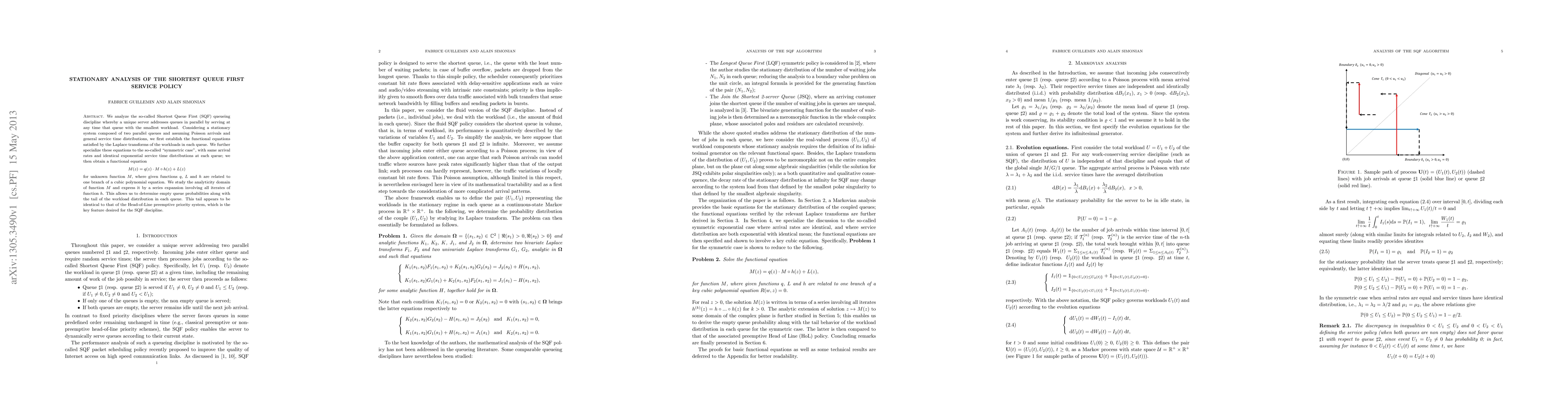 This paper analyzes the Shortest Queue First (SQF) service policy in a stationary system with two parallel queues, establishing functional equations for workload Laplace transforms. It derives a specialized functional equation for symmetric cases and uses it to determine empty queue probabilities and the tail of workload distributions, revealing similarities to the Head-of-Line preemptive priority system.