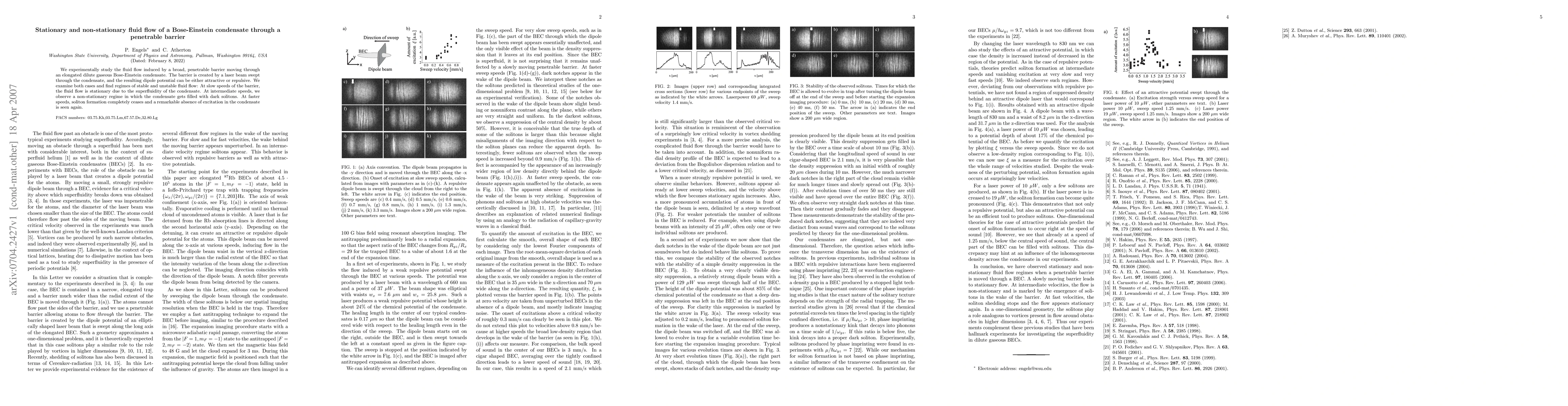 This study experimentally investigates the fluid dynamics of a Bose-Einstein condensate in response to a moving penetrable barrier, revealing stable and non-stationary flow regimes. At slow barrier speeds, superfluidity maintains stationary flow, while at intermediate speeds, dark solitons form, and at high speeds, the condensate remains excitation-free.