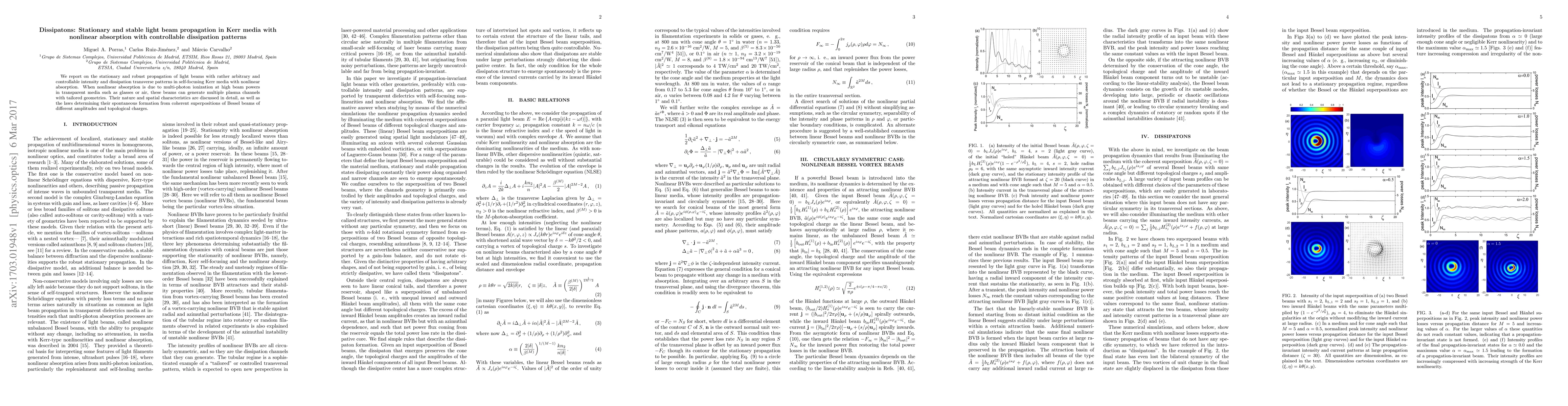 We report on the stationary and robust propagation of light beams with rather arbitrary and controllable intensity and dissipation transverse patterns in self-focusing Kerr media with nonlinear absorption. When nonlinear absorption is due to multi-photon ionization at high beam powers in transparent media such as glasses or air, these beams can generate multiple plasma channels with tailored geometries. Their nature and spatial characteristics are discussed in detail, as well as the laws determining their spontaneous formation from coherent superpositions of Bessel beams of different amplitudes and topological charges.