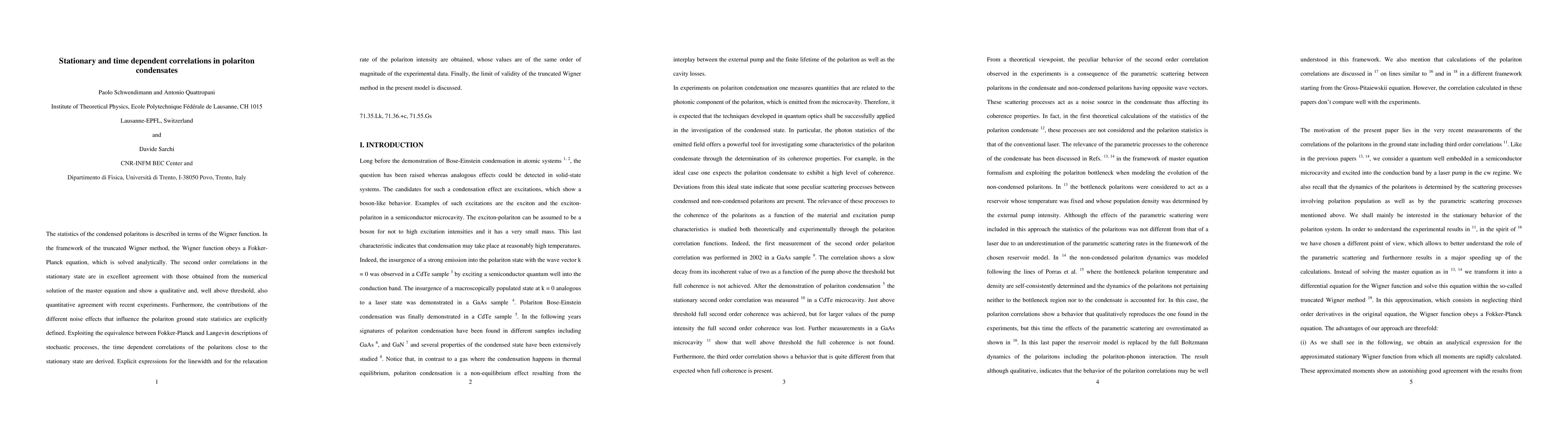 The statistics of the condensed polaritons is described in terms of the Wigner function. In the framework of the truncated Wigner method, the Wigner function obeys a Fokker- Planck equation, which is solved analytically. The second order correlations in the stationary state are in excellent agreement with those obtained from the numerical solution of the master equation and show a qualitative and, well above threshold, also quantitative agreement with recent experiments. Furthermore, the contributions of the different noise effects that influence the polariton ground state statistics are explicitly defined. Exploiting the equivalence between Fokker-Planck and Langevin descriptions of stochastic processes, the time dependent correlations of the polaritons close to the stationary state are derived. Explicit expressions for the linewidth and for the relaxation rate of the polariton intensity are obtained, whose values are of the same order of magnitude of the experimental data. Finally, the limit of validity of the truncated Wigner method in the present model is discussed.