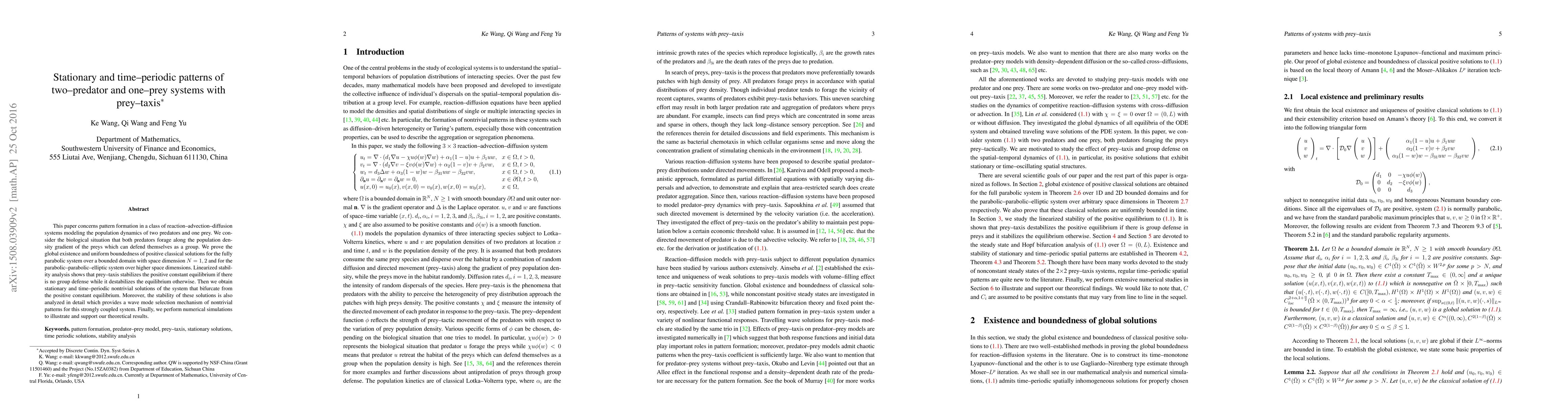 This paper investigates pattern formation in reaction-advection-diffusion systems modeling two-predator and one-prey dynamics with prey-taxis, proving global existence and stability of solutions, and identifying bifurcations leading to stationary and time-periodic patterns. Numerical simulations support the theoretical findings.