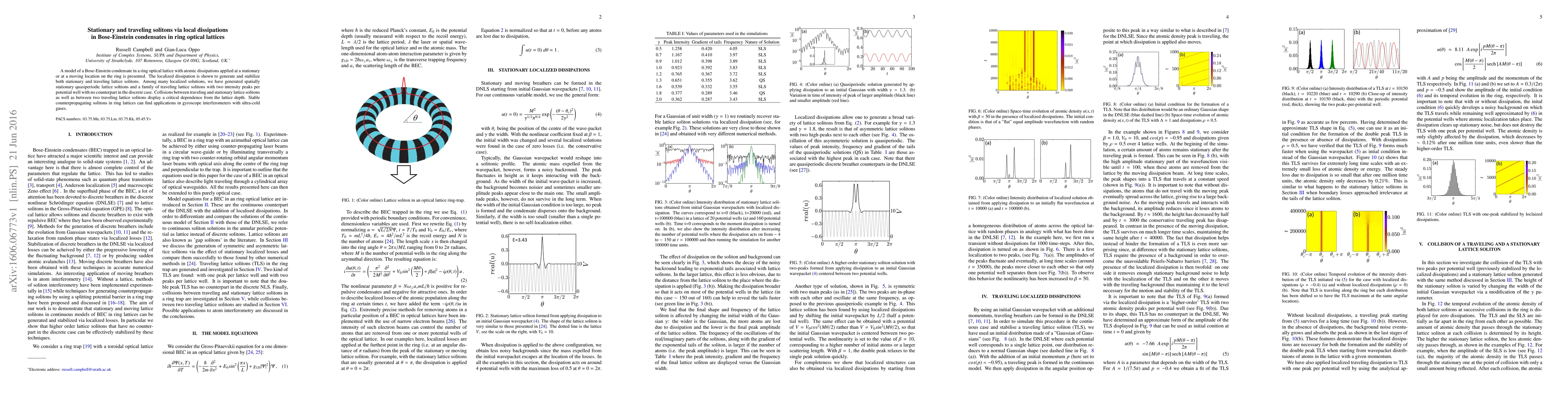 This paper presents a model for Bose-Einstein condensates in ring optical lattices with localized dissipations, showing the generation and stabilization of both stationary and traveling solitons. The study reveals unique quasiperiodic and traveling lattice solitons, with soliton behavior critically dependent on lattice depth, potentially useful in gyroscope interferometers.