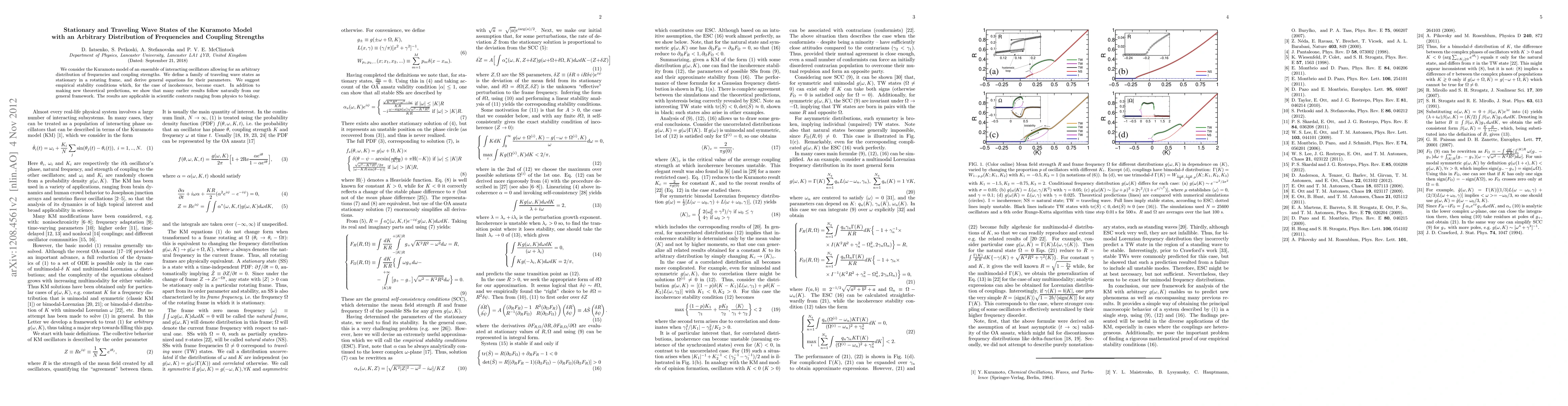 We consider the Kuramoto model of an ensemble of interacting oscillators allowing for an arbitrary distribution of frequencies and coupling strengths. We define a family of traveling wave states as stationary in a rotating frame, and derive general equations for their parameters. We suggest empirical stability conditions which, for the case of incoherence, become exact. In addition to making new theoretical predictions, we show that many earlier results follow naturally from our general framework. The results are applicable in scientific contexts ranging from physics to biology.