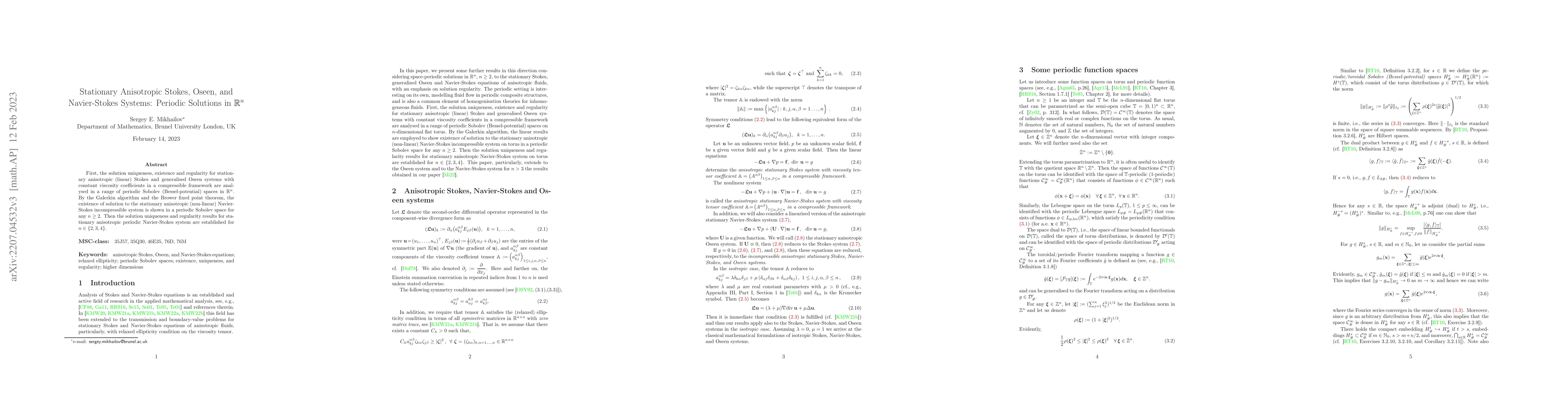 This paper investigates the existence, uniqueness, and regularity of solutions for stationary anisotropic Stokes, Oseen, and Navier-Stokes systems in periodic Sobolev spaces on $\R^n$. It employs the Galerkin method to establish the existence of solutions for the Navier-Stokes system and proves uniqueness and regularity for $n\in\{2,3,4\}$.