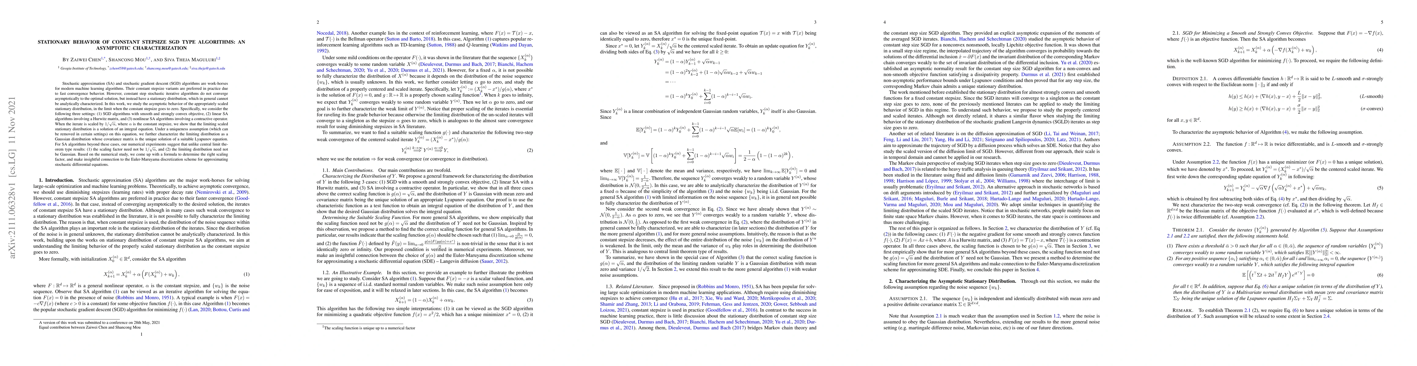 This paper studies the asymptotic behavior of constant stepsize SGD type algorithms, showing that their limiting stationary distribution can be characterized as a Gaussian distribution with a specific covariance matrix, which can be solved using Lyapunov equations.