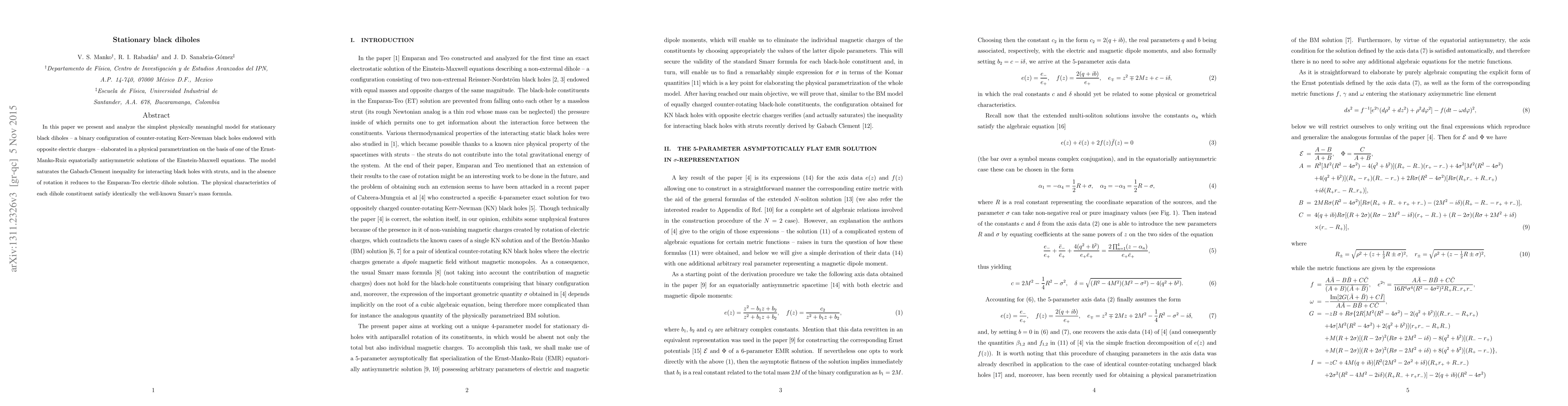 The paper elaborates on a physically parametrized model for stationary black diholes, deriving a 4-parameter solution from a 5-parameter EMR configuration and demonstrating its consistency with Smarr's mass formula and the Gabach-Clement inequality.